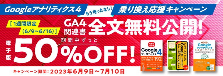 7月1日にGoogleアナリティクスが提供する「ユニバーサルアナリティクス(UA)」が廃止され、新しい「Google アナリティクス 4(GA4)」に切り替えられます。GA4は従来のUAと機能や測定方法などが異なるため、いまだに移行へ踏み出せずにいたり、移行してもUAのように使いこなせなかったりという方も多くいるのではないでしょうか。そこで当社では、GA4への移行、移行後の活用に役立つ電子書籍3タイトルを50%OFFで販売する「GA4乗り換え応援キャンペーン」を実施いたします。