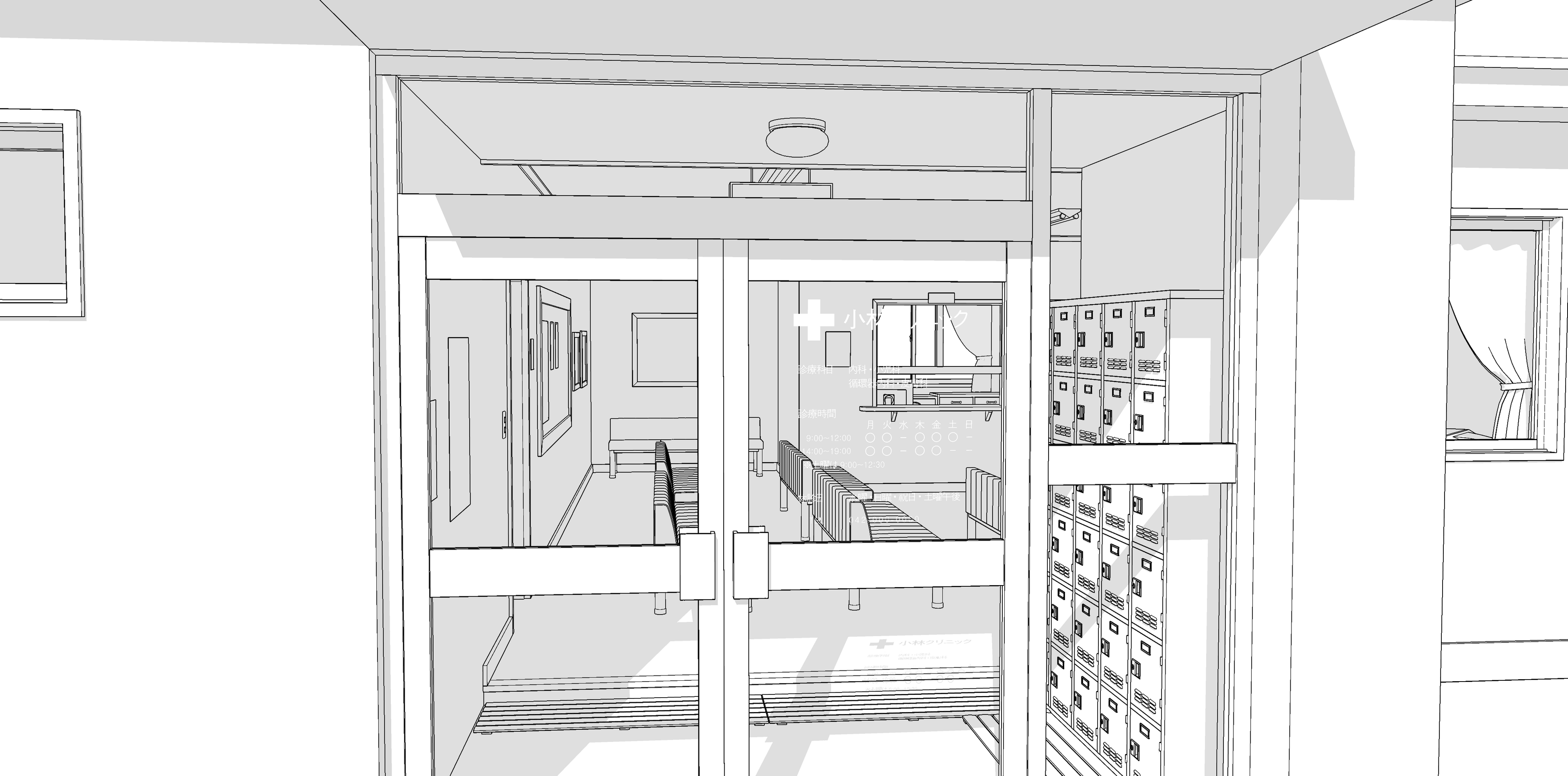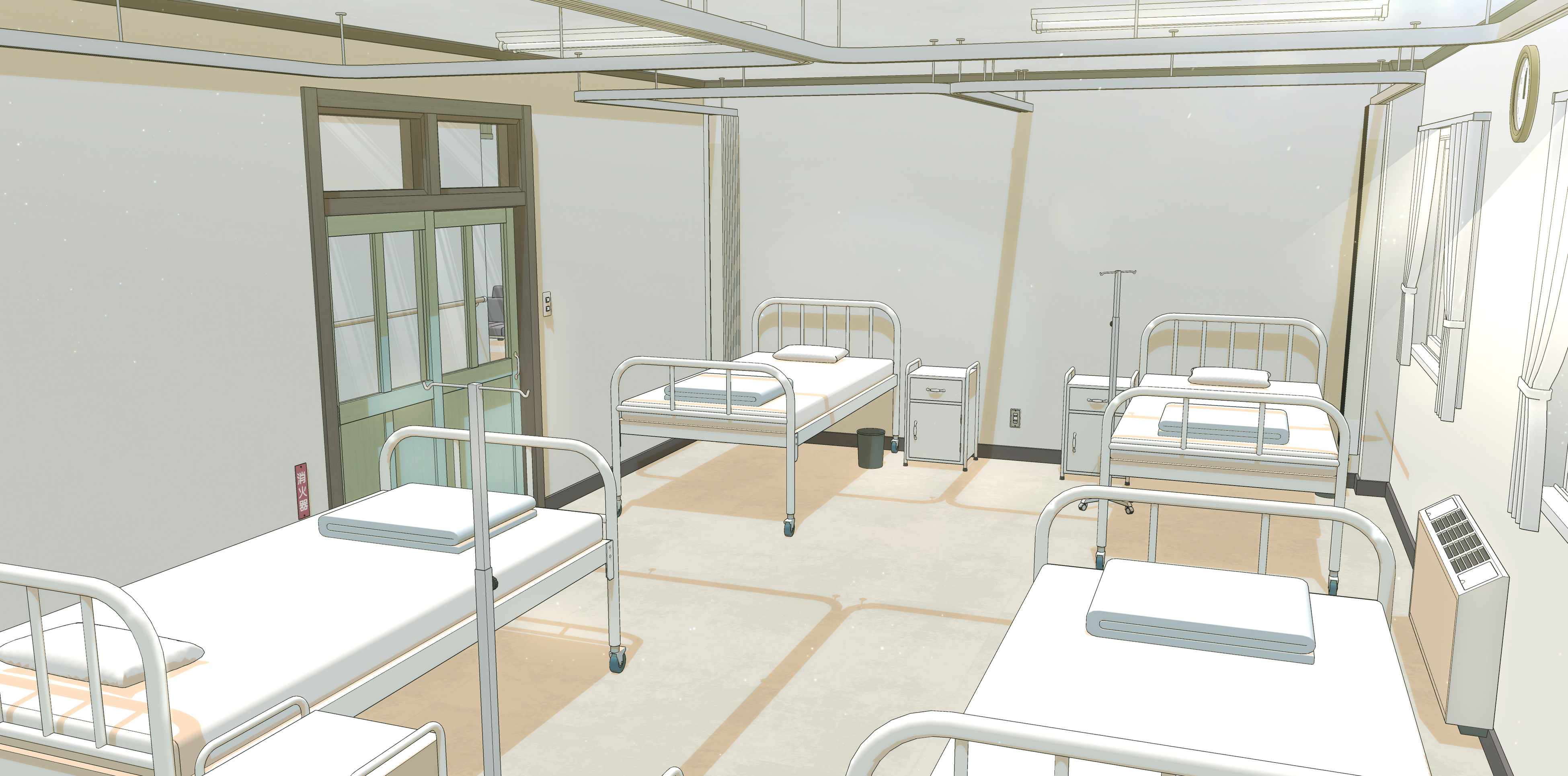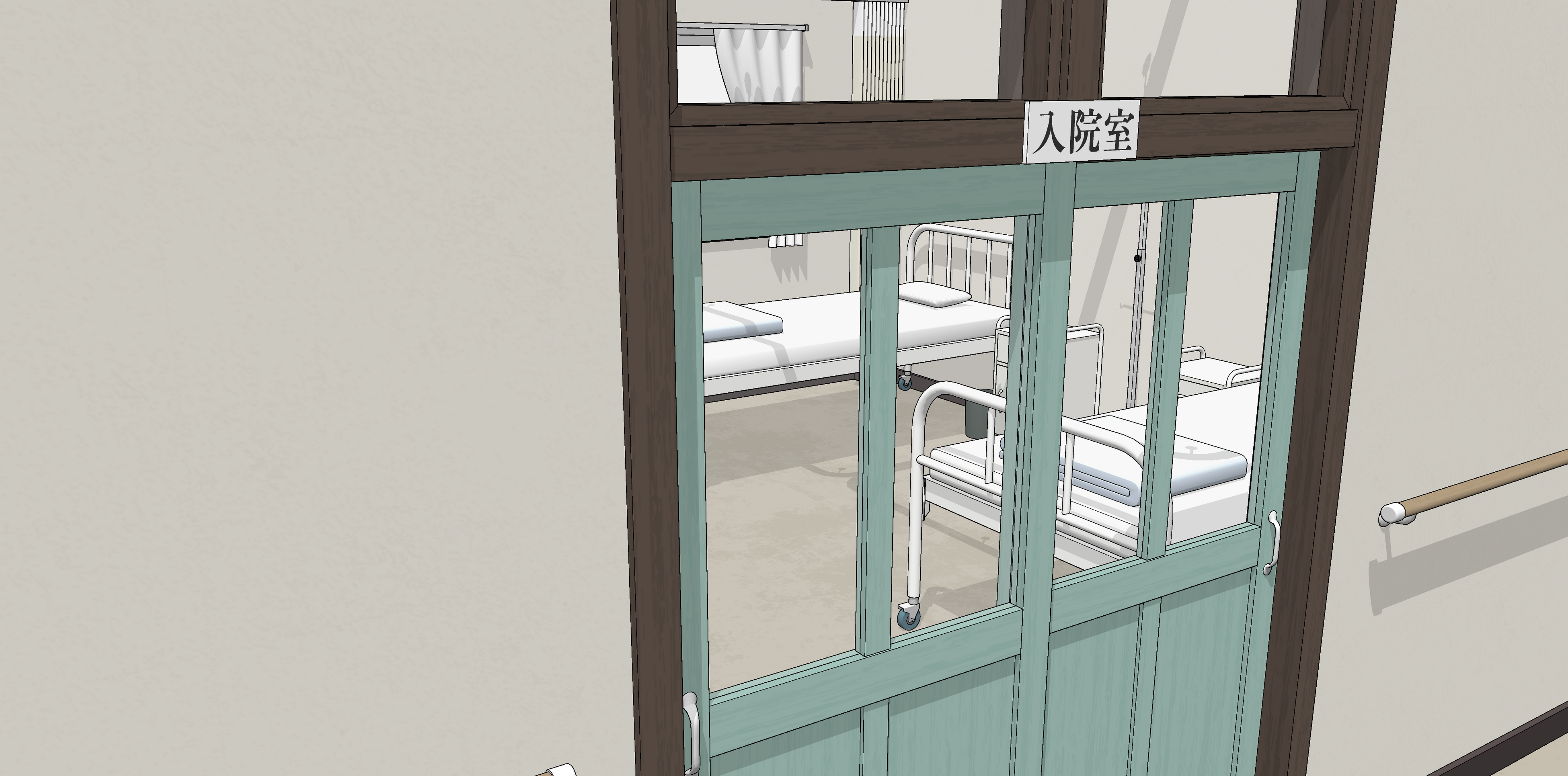 この3D背景は、地方の小都市にある診療所を時代を感じさせるデザインでリアルに再現したものです。