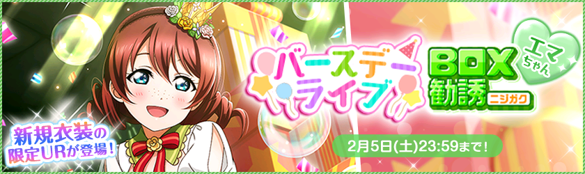 株式会社ブシロード(本社:東京都中野区、代表取締役社長:橋本義賢)は、KLab株式会社(本社:東京都港区、代表取締役社長:森田英克)と共同開発いたしましたスマートフォン向けアプリ『ラブライブ!スクールアイドルフェスティバル』(以下、スクフェス) において、虹ヶ咲学園スクールアイドル同好会エマ・ヴェルデ誕生日記念キャンペーンの開催をお知らせいたします。是非貴社の媒体にてお取り扱い頂きますようお願い申し上げます。