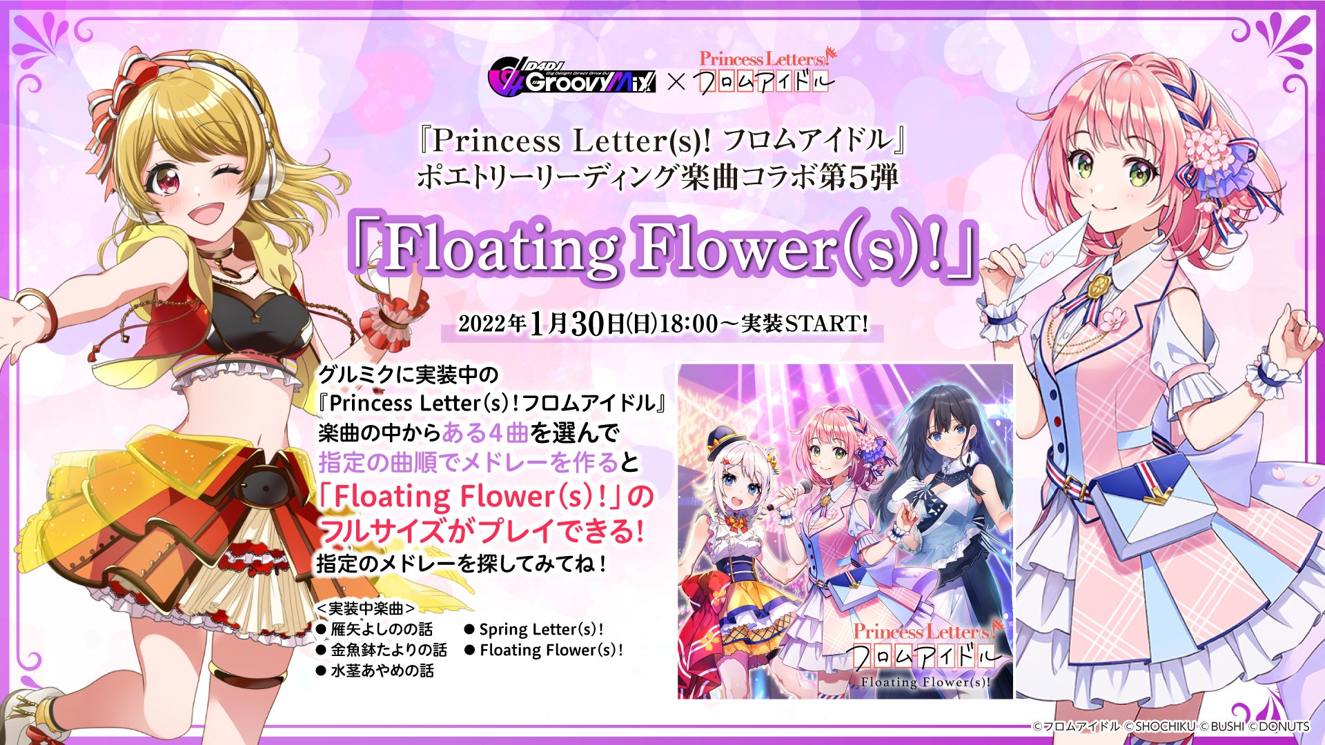 グルミクに実装中の『Princess Letter(s)! フロムアイドル』楽曲の中から、ある4曲を選んで指定の曲順でメドレーを作ると「Floating Flower(s)!」のフルサイズがプレイできます。