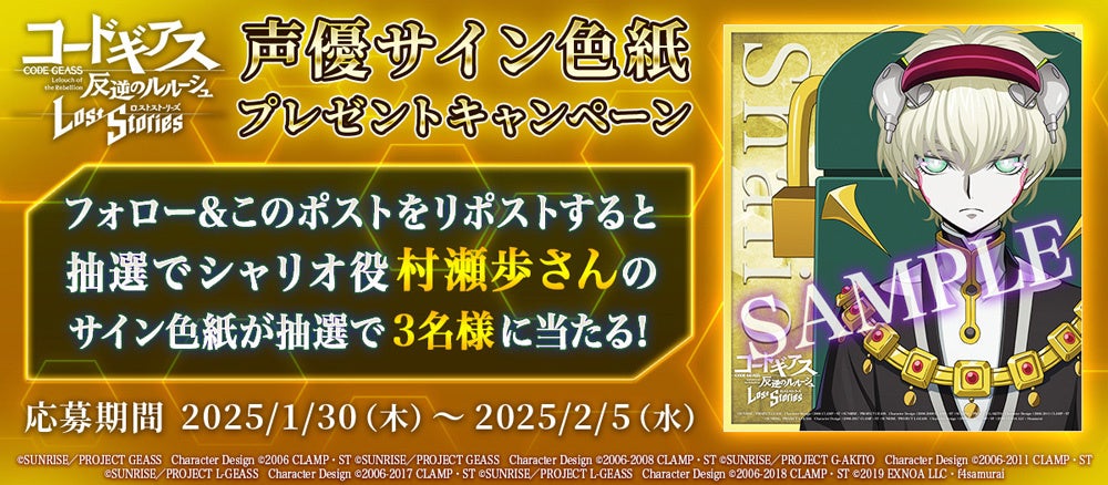 期間中にロススト公式Xをフォローし、対象のポストをリポストすると、 櫻井孝宏さん、村瀬歩さんのサイン入り色紙が抽選で3名様に当たります。是非ふるってご参加ください!