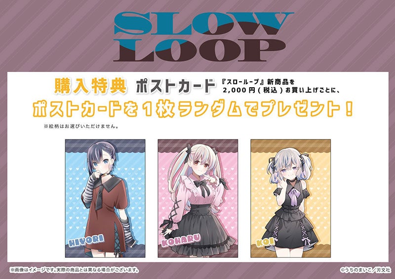 期間中、ゲーマーズオンラインショップにて『スローループ』【新商品】を2,000円(税込)お買い上げごとに、特典ポストカード(全3種)をランダムで1枚プレゼント!