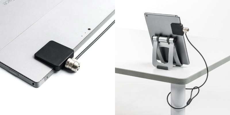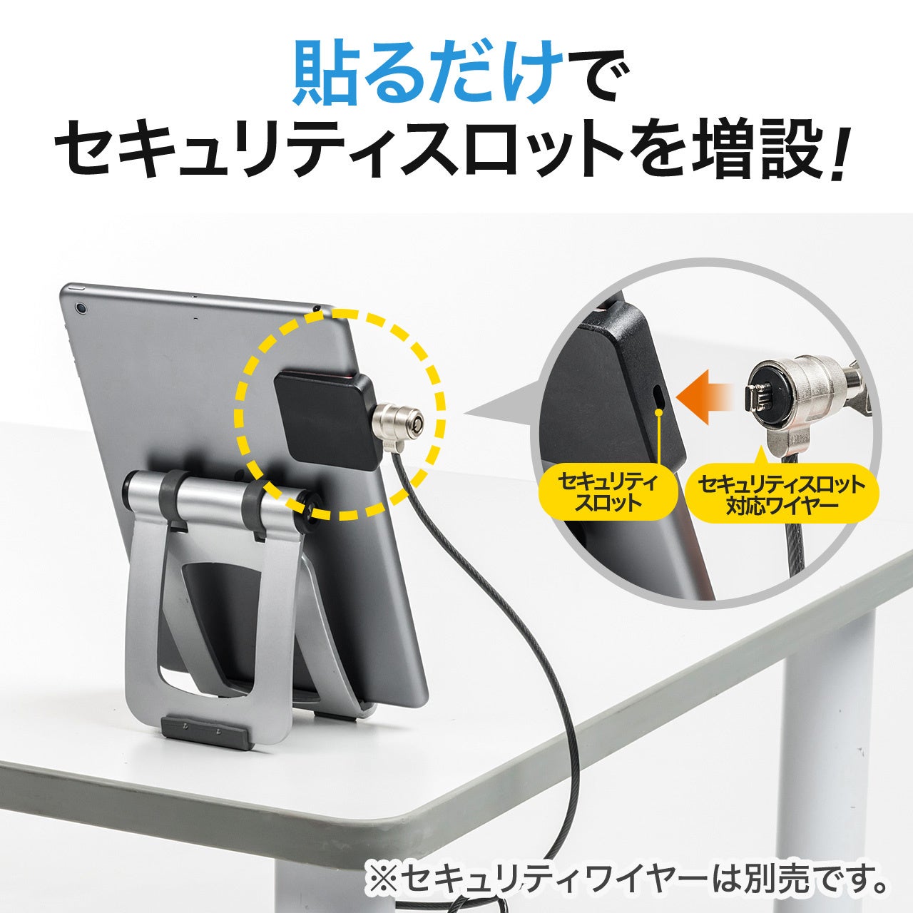本製品は、iPadなどのタブレット、Surface、ノートパソコンなどに貼り付けてセキュリティスロットを増設できる、セキュリティ部品です。