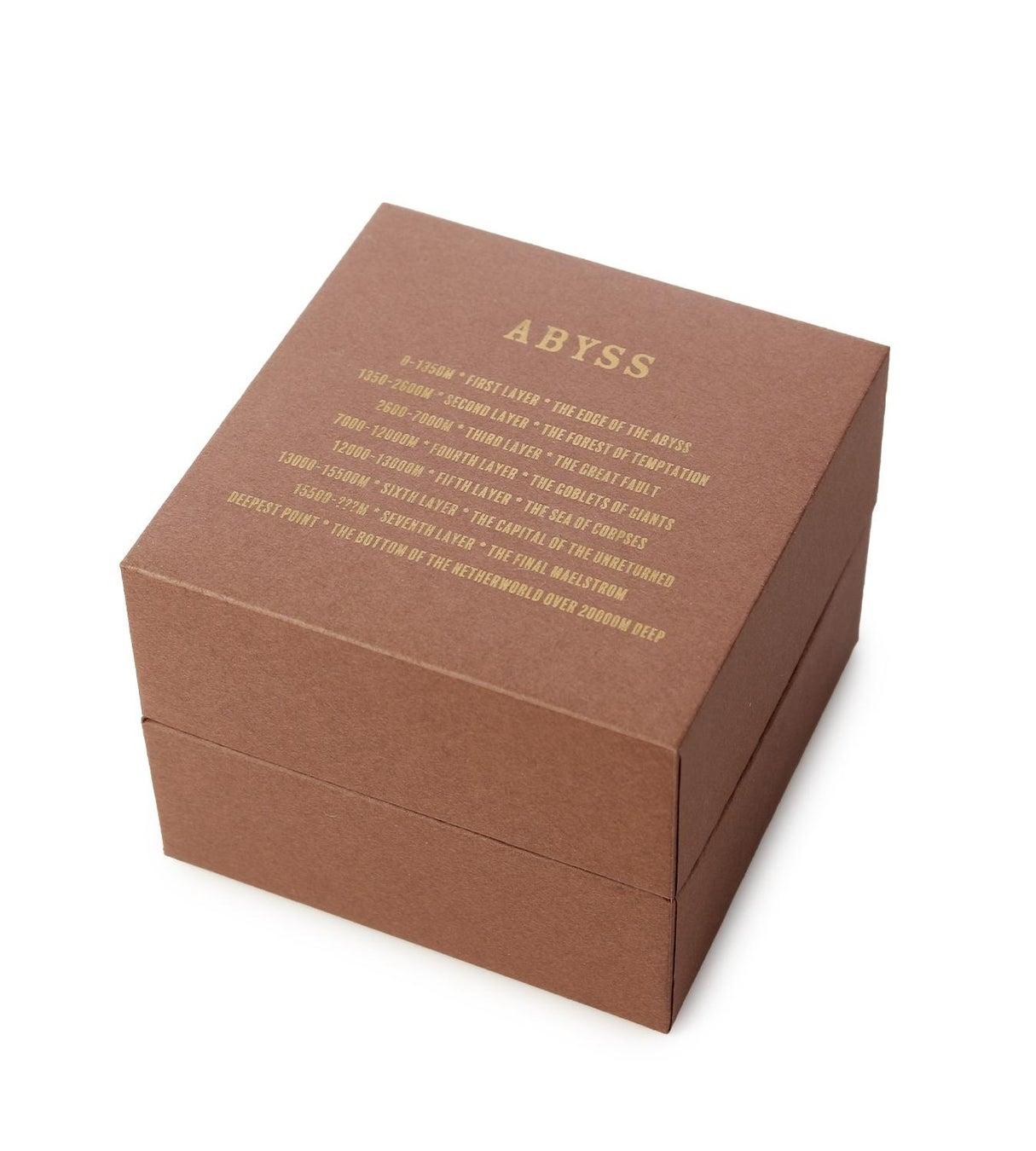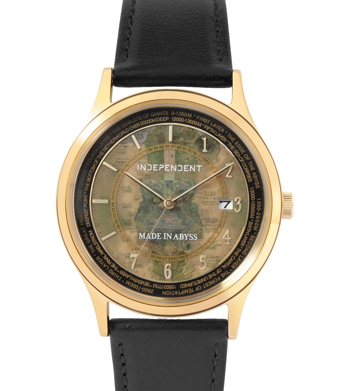 文字盤はアビスの地図を背景に、盤面周囲には各階層の名称や深度をデザイン。1時、2時、3時、4時、5時、6時、7時のインデックスは深界をイメージして、数字で表記しております。