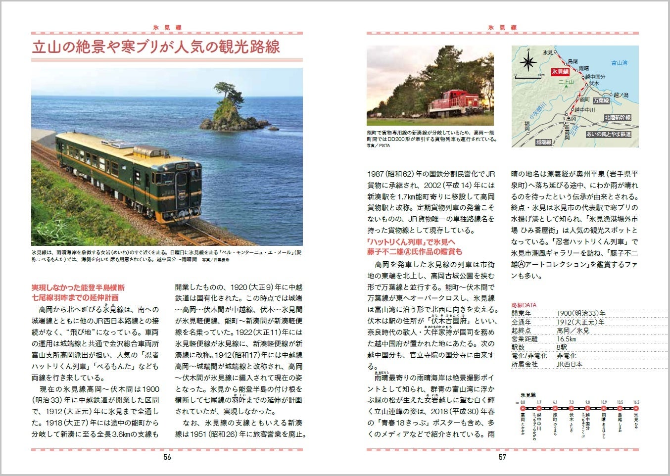 本文では、駅名・営業キロなどのデータ、地図等を掲載し、詳しく解説しています。サンプルは『北陸・信越本線』の氷見線です。