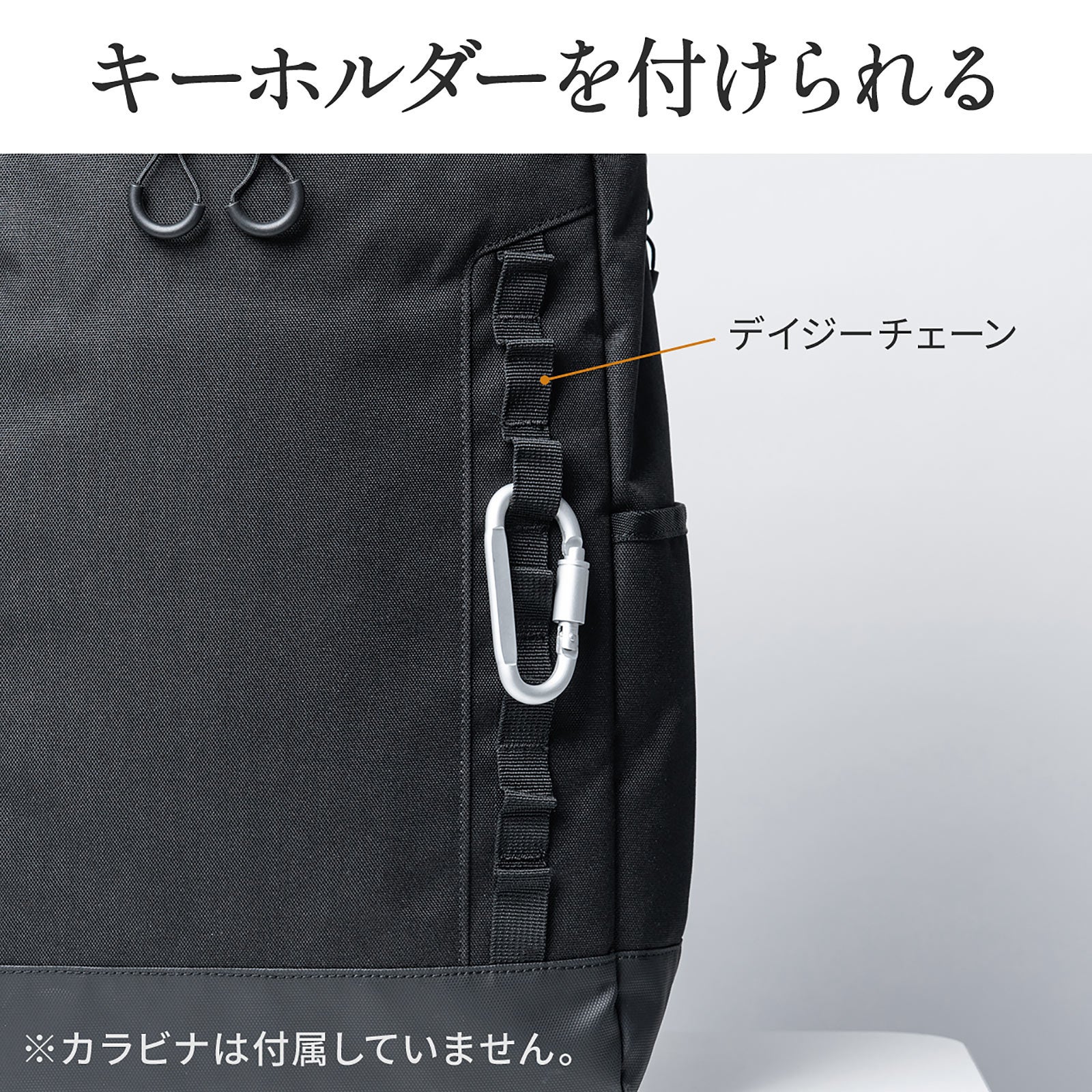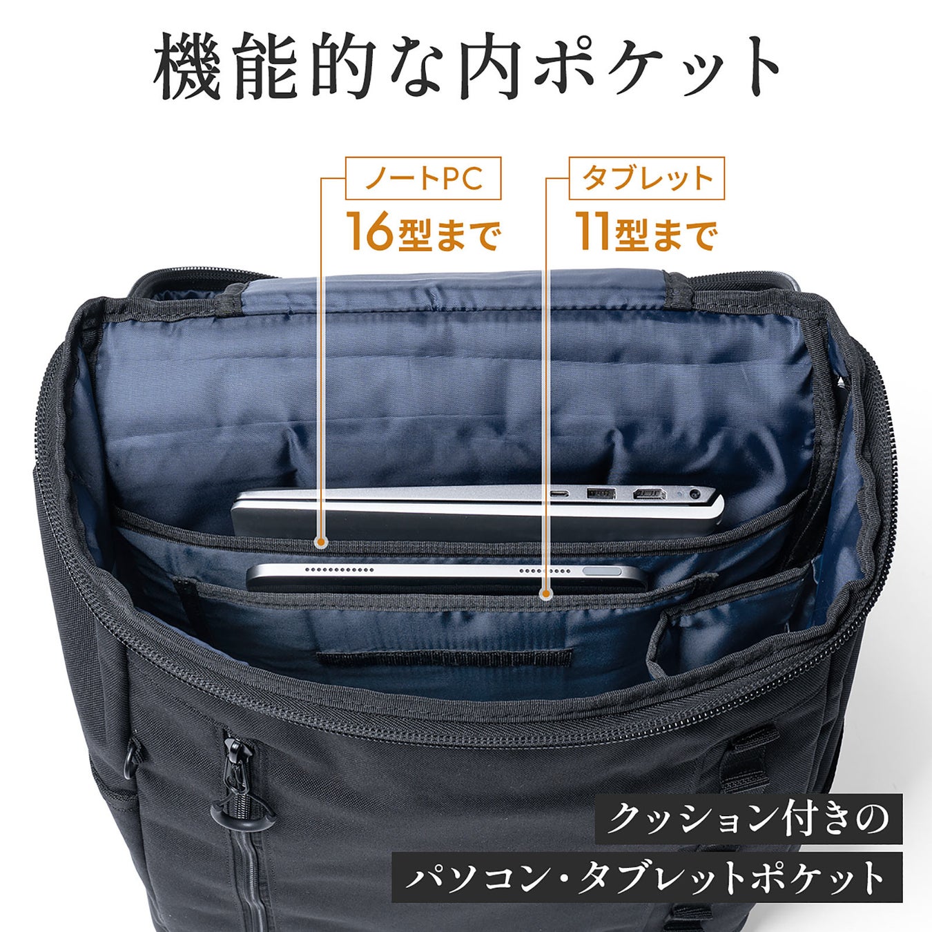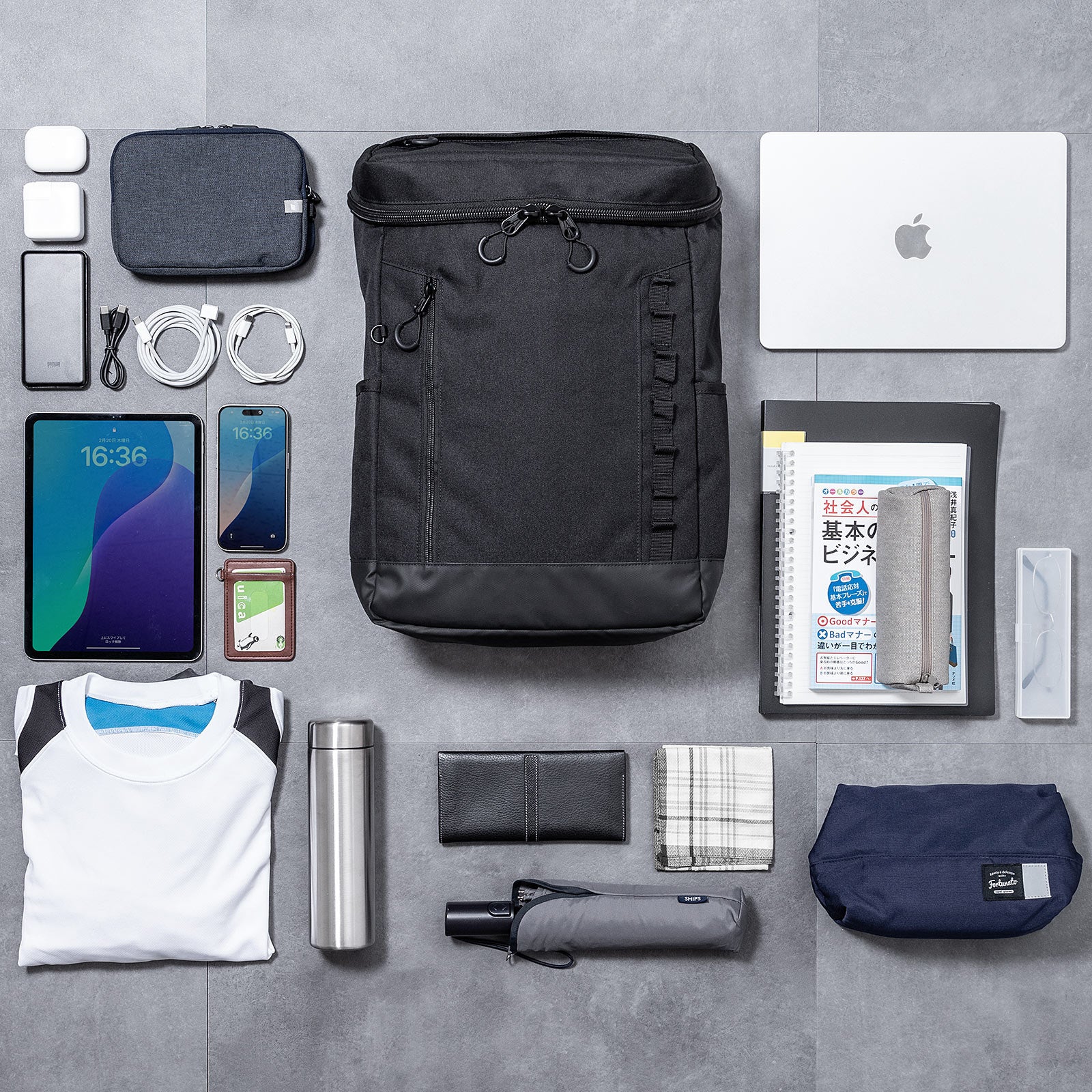 通勤や通学、普段使いに便利なロゴレスのシンプルデザインで、16インチのノートPCが収納できる収納力の高い、書類や教科書が折れにくいスクエア型リュック