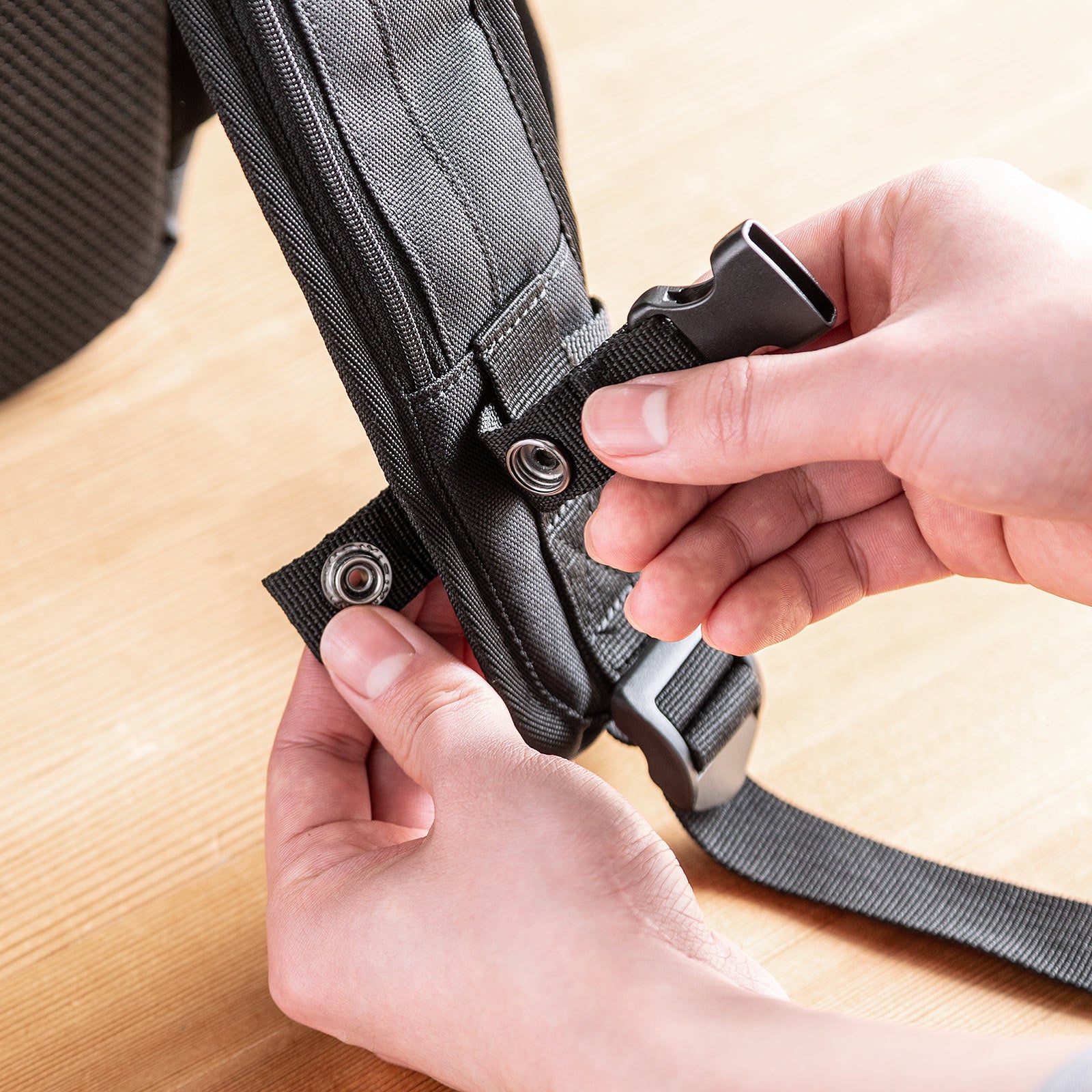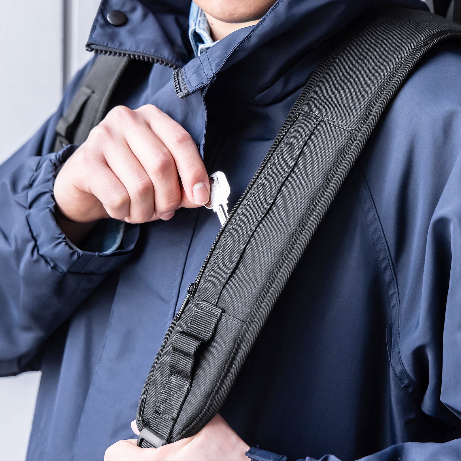 メイン収納部は26Lでたっぷり収納することができます。16個のポケットを備えているので、ノートPCやタブレット、書類、小物類をすっきり整理できます。ノートPCは16インチ、タブレットは11インチまで収納可能で、ボトルホルダーやショルダーベルトのポケットもあり、取り出しやすさも抜群です。