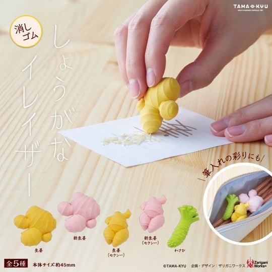 【新商品】文字を消している様はまさに生姜をすり下ろしている姿そのもの…生姜が消しゴムになった「しょうがなイレイザー」が本日2月7日(月)より全国のカプセルトイコーナーで発売!