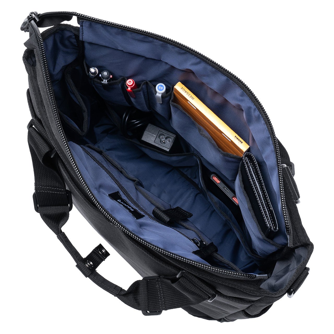 ●メイン収納部には15.6インチまでのノートPC、11インチまでのタブレットを収納できるクッション付きのポケットと、ファスナーやベルト付きの小物ポケット、ペン/ボトルホルダーなどが備わっています。