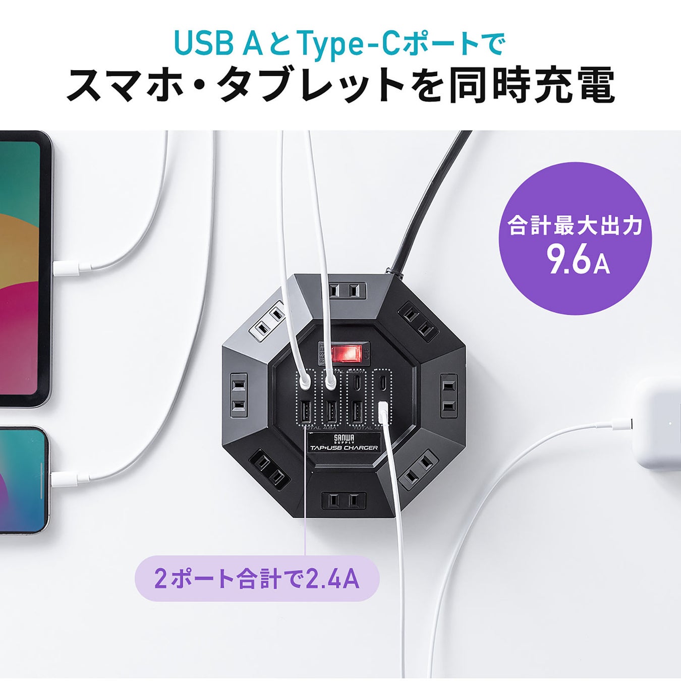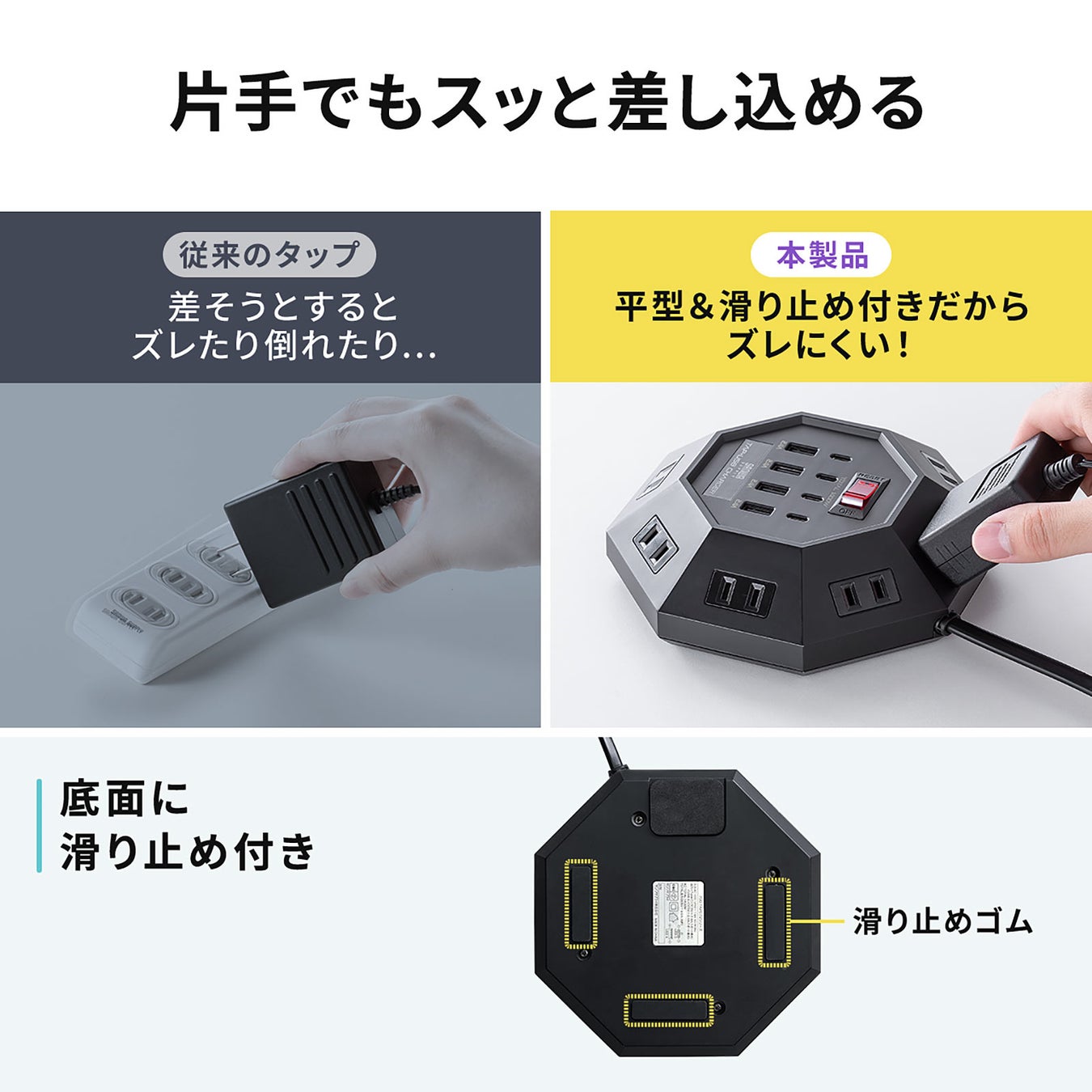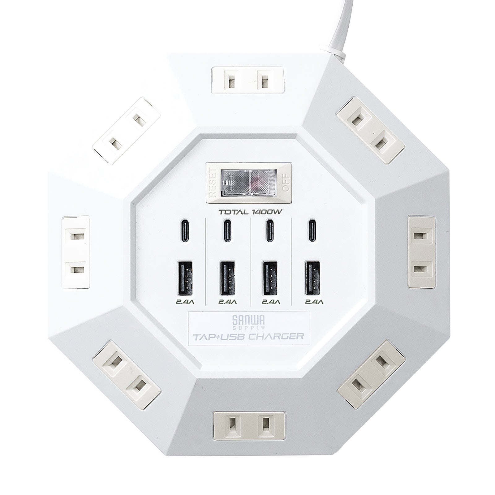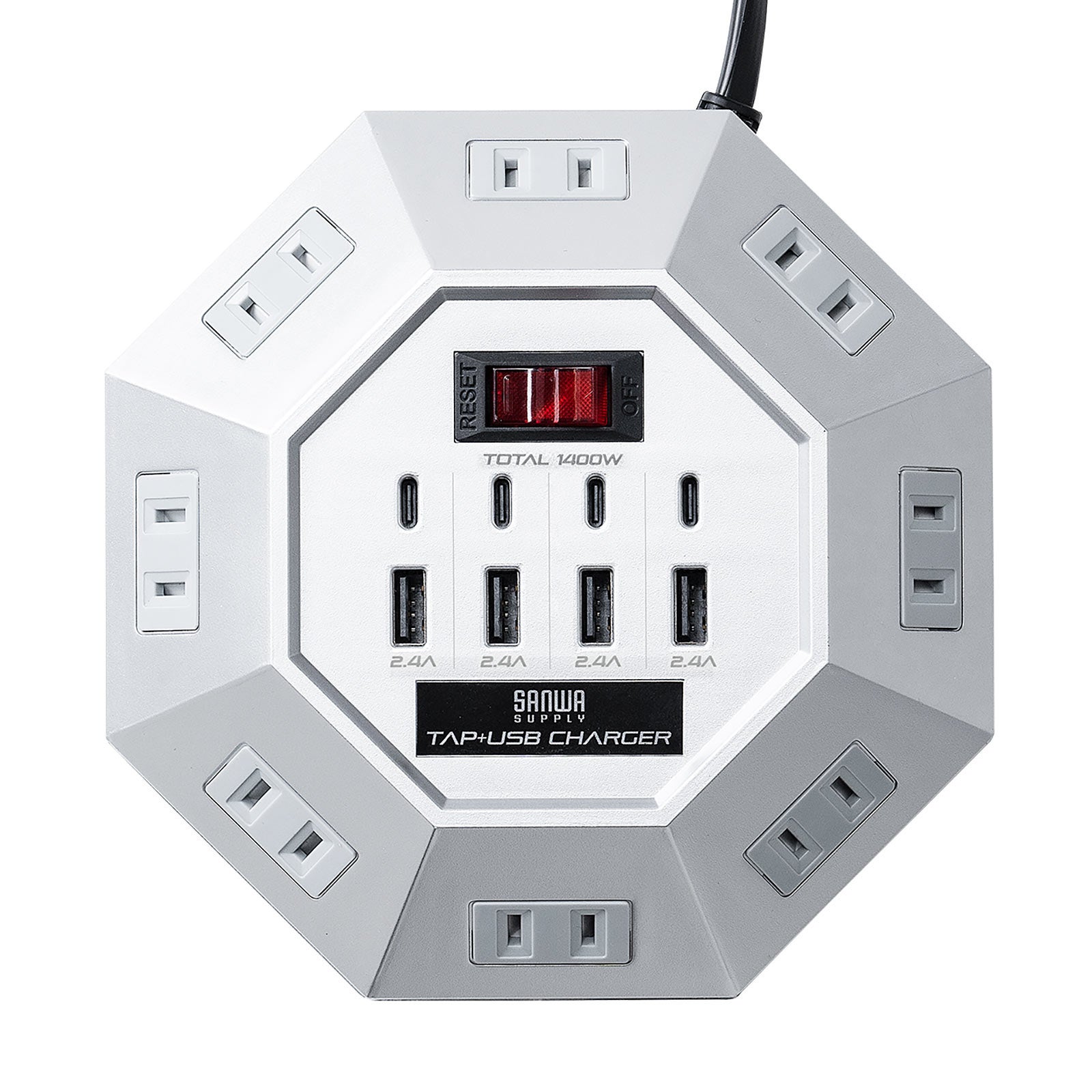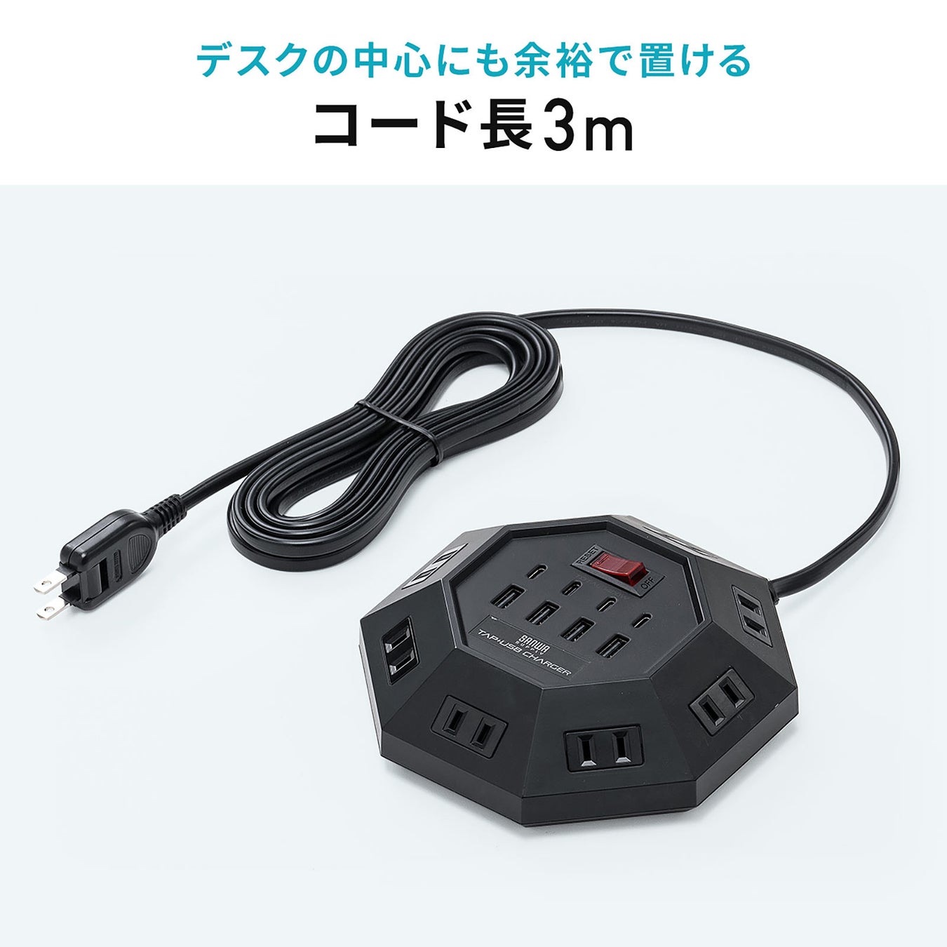 電源タップ USB充電付 クランプ固定 8個口 八角形 Type-C対応 ケーブル3m
