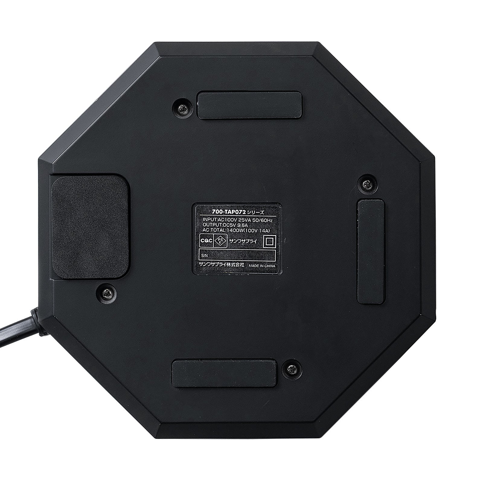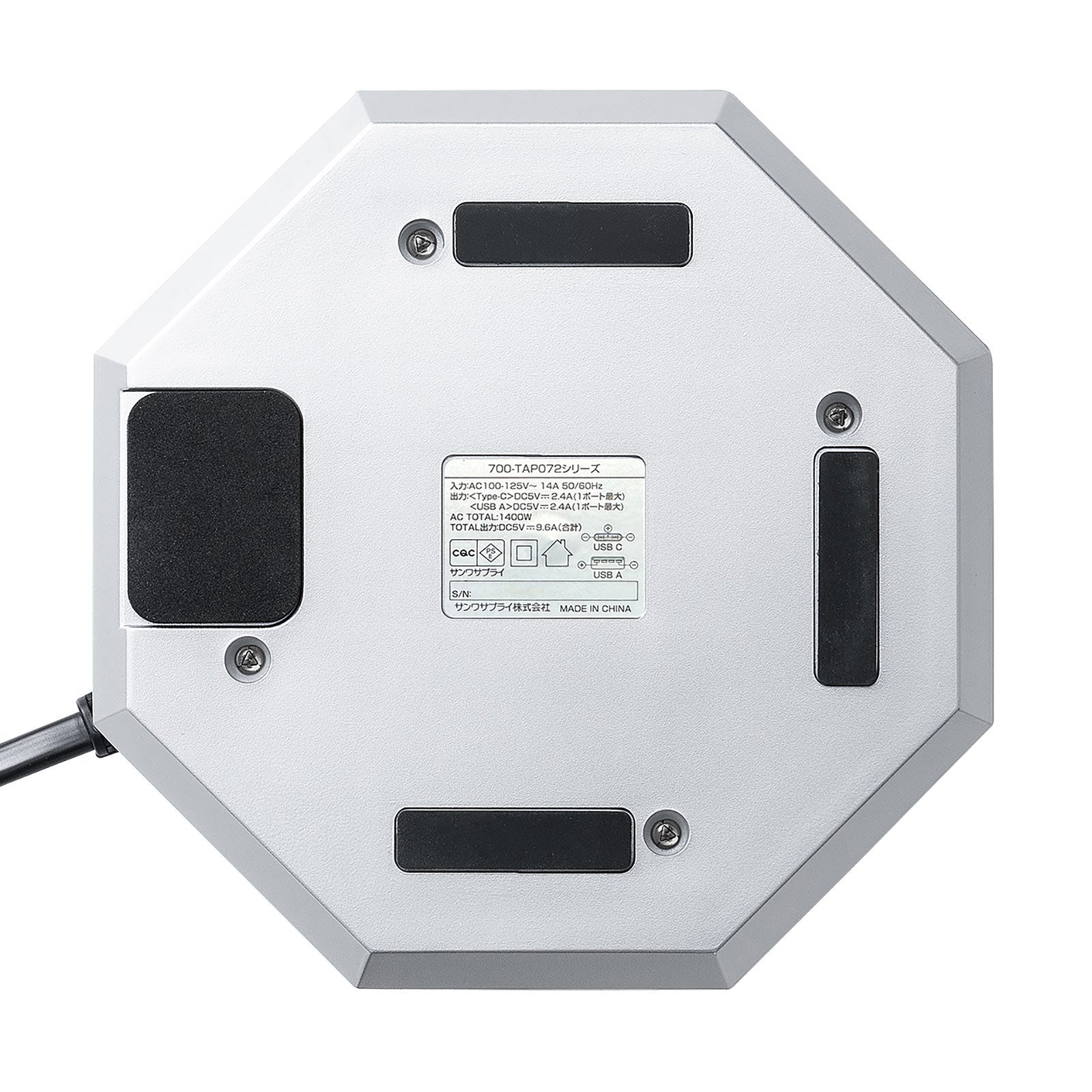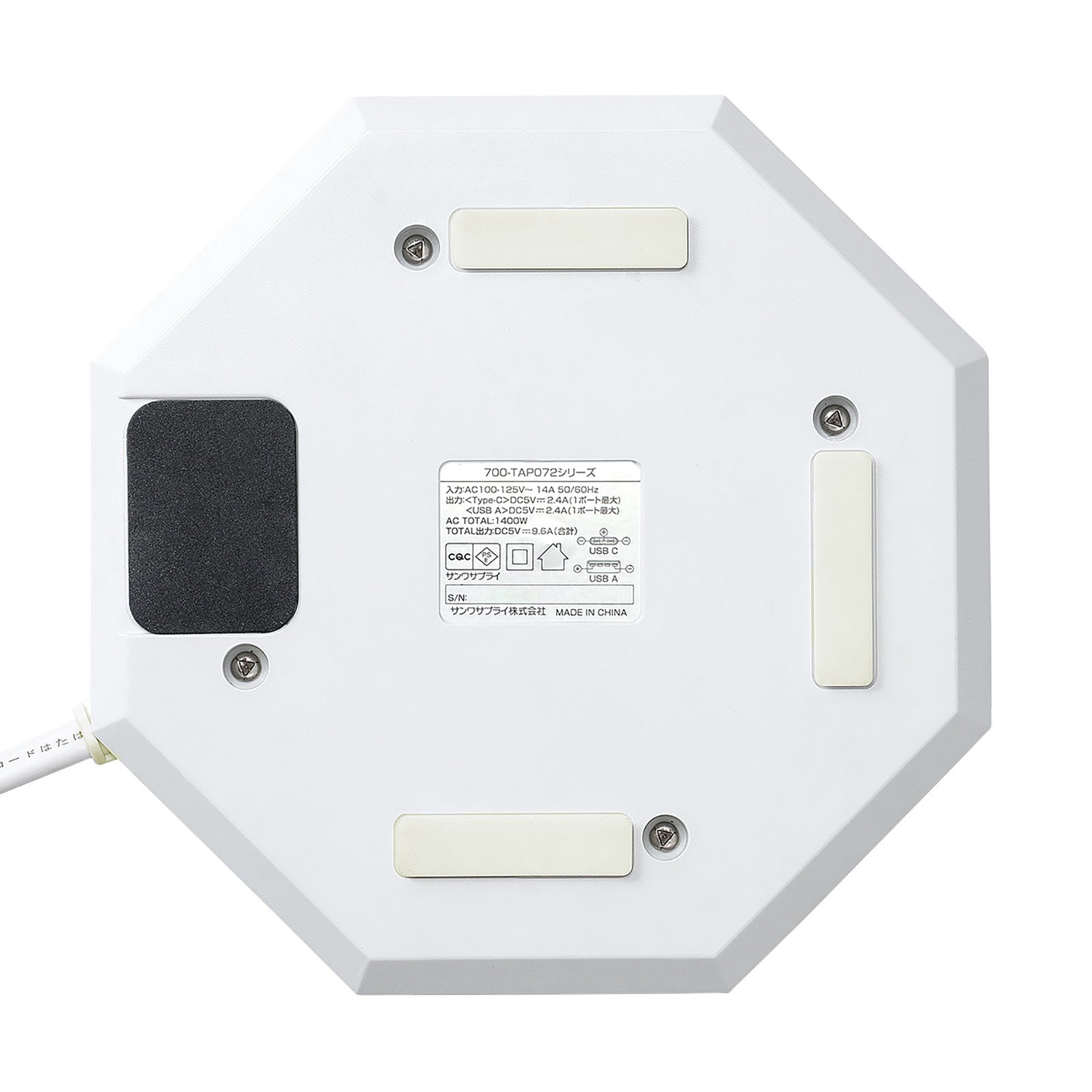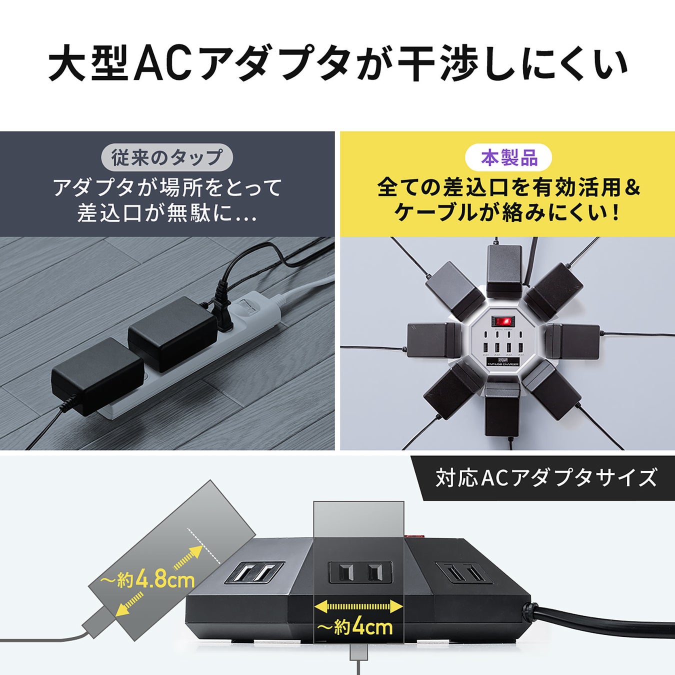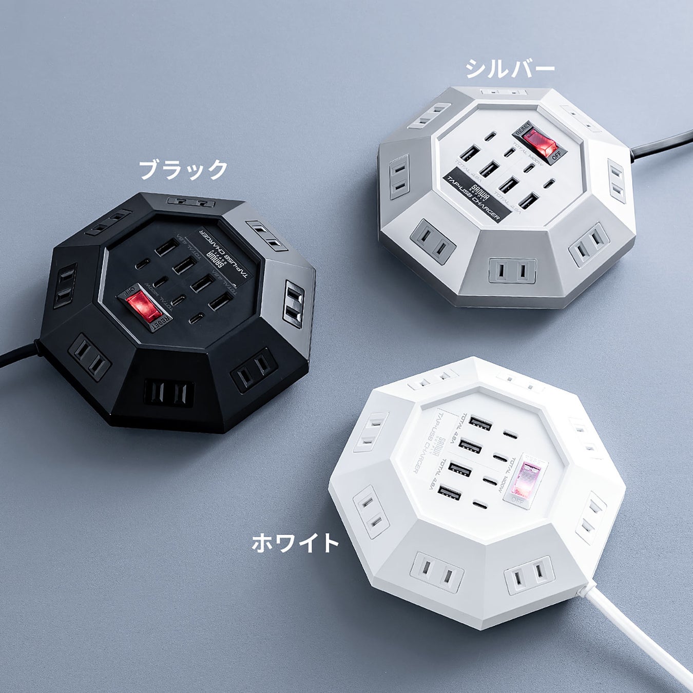 電源タップ USB充電付 クランプ固定 8個口 八角形 Type-C対応 ケーブル3m