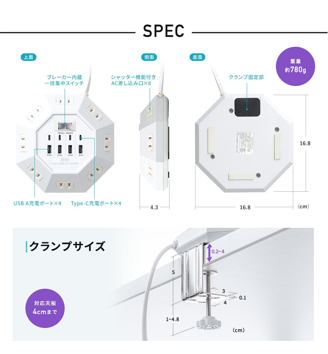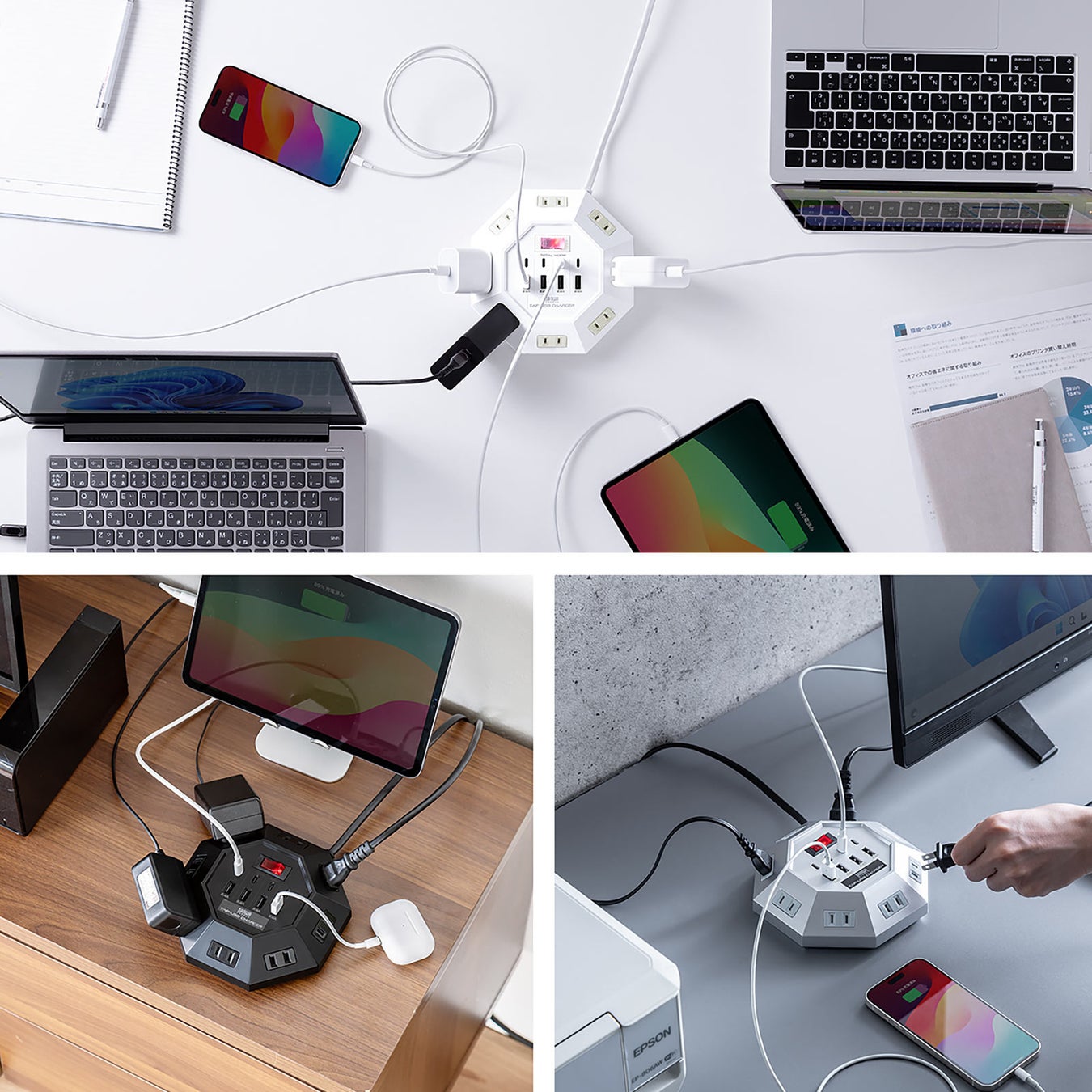 AC×8個口、Type-C×4、USB-A×4ポート搭載でスマートフォンの充電にも対応したクランプ固定も可能で会議などで使用しやすい8角形の電源タップ