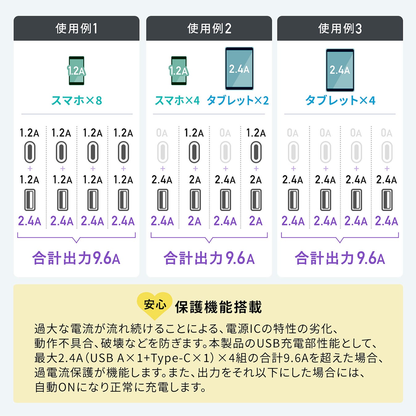 Type-Cポート×4、USB-Aポート×4を搭載し、タブレットやスマートフォンを同時に最大8台まで充電可能。スマートIC機能も搭載しており、接続機器を自動認識して最適な充電ができます。