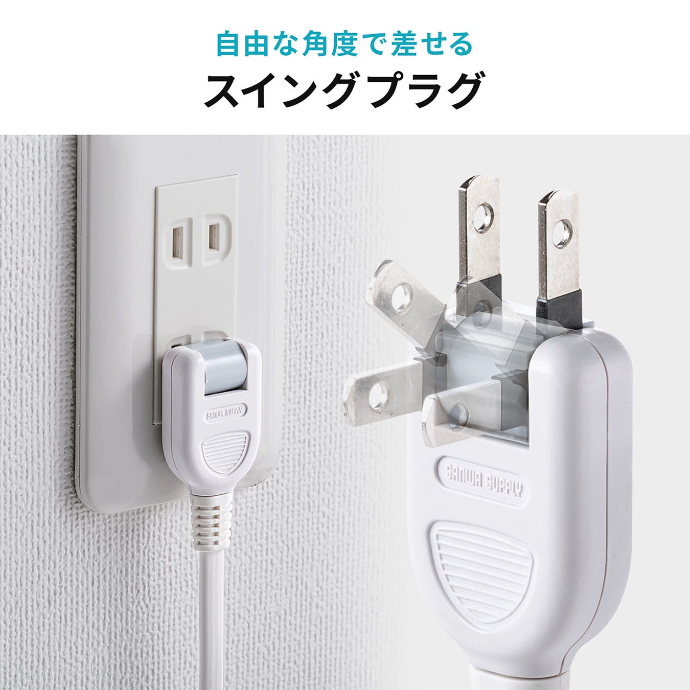 電源コード長3mで、上下昇降デスクや広い会議室でも余裕のある接続が可能。スイングプラグを採用しているため、狭い場所でも簡単に差し込むことができます。