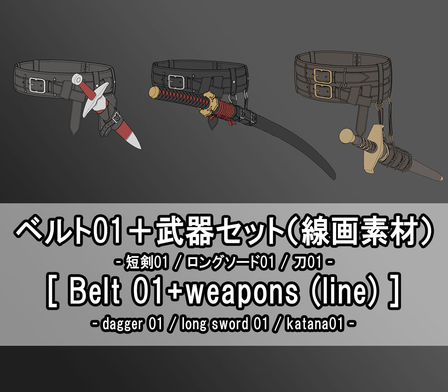 ベルト01+武器セット(線画素材)[刀01、ロングソード01、短剣01]