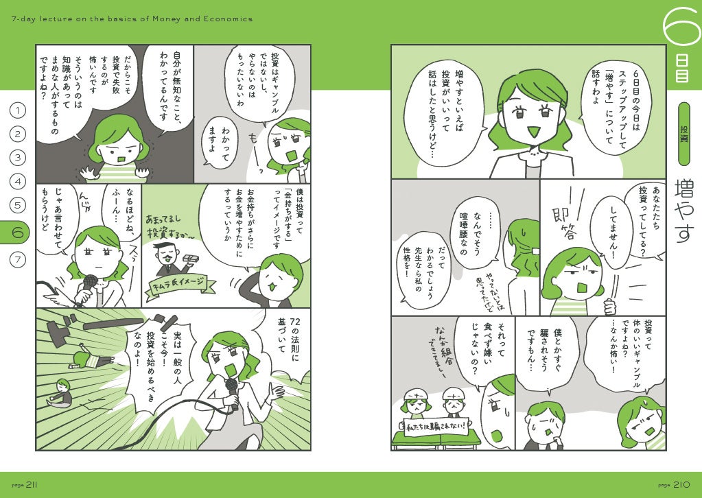 本書はタイトル通り、お金に関する知識を全編マンガ・たった7日で身につけるというコンセプトになっています。「お金のことは気になるけど、まだまだ分からないことだらけ」という「お金の知識・超初心者さん」にはまさにうってつけ! 以下のような構成で、知っておきたいお金の知識をひと通り身につけられるようになっています。