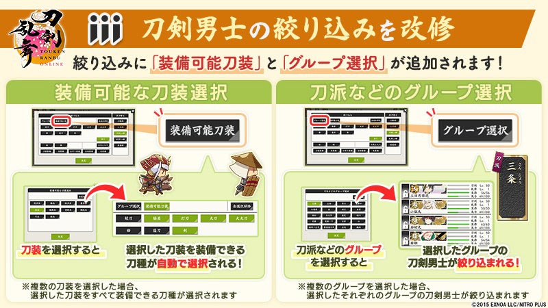 また、刀剣男士に装備する刀装を選択する際に装備可能な刀装を絞り込むことも可能となりました。