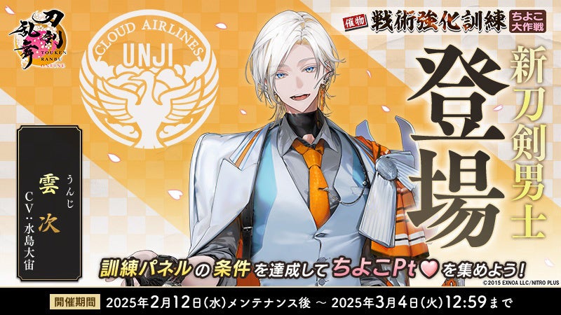 合同会社EXNOA(本社:東京都港区、CEO:村中 悠介、URL:https://games.dmm.com/)は、同社が開発・運営、株式会社ニトロプラスが世界観・シナリオ・キャラクターデザインを担当している、刀剣育成シミュレーション『刀剣乱舞ONLINE』にて、2025年2月12日(水)メンテナンス後より新刀剣男士「雲次(cv.水島大宙)」を入手できるイベント「戦術強化訓練 ~ちよこ大作戦~」を開催していることをお知らせいたします。