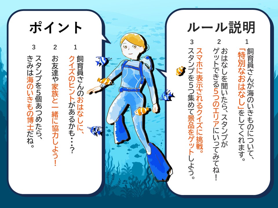 ふだんは聞けない「飼育に関するひみつ」がわかる「飼育員さんからのおはなしコーナー」や、館内を巡り、各所に設置されたクイズを家族で協力しながらたのしく学ぶ「飼育員さんからの挑戦状!!海のいきものクイズラリー」など、いつもとは違うアクアマリンふくしまを楽しむことができます。