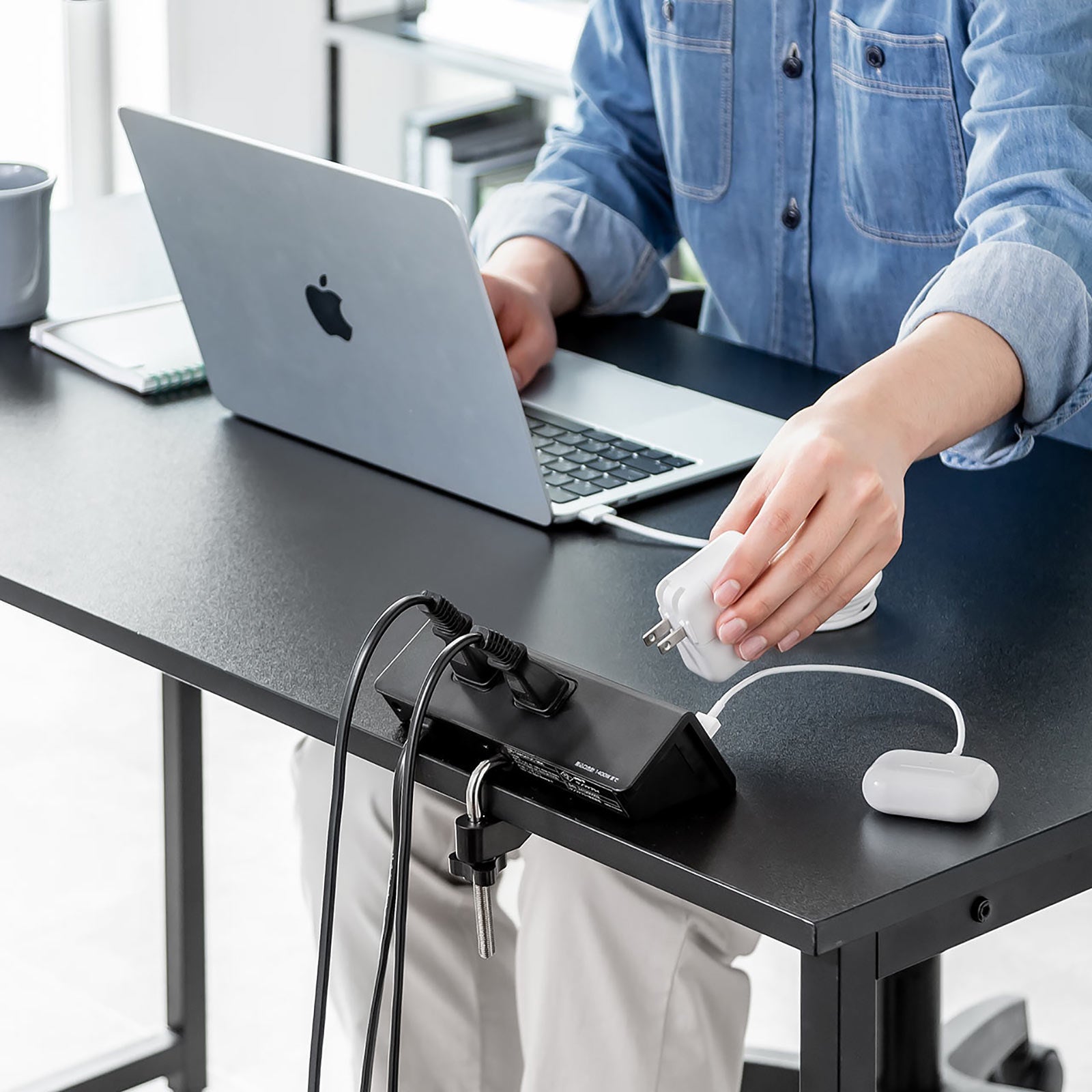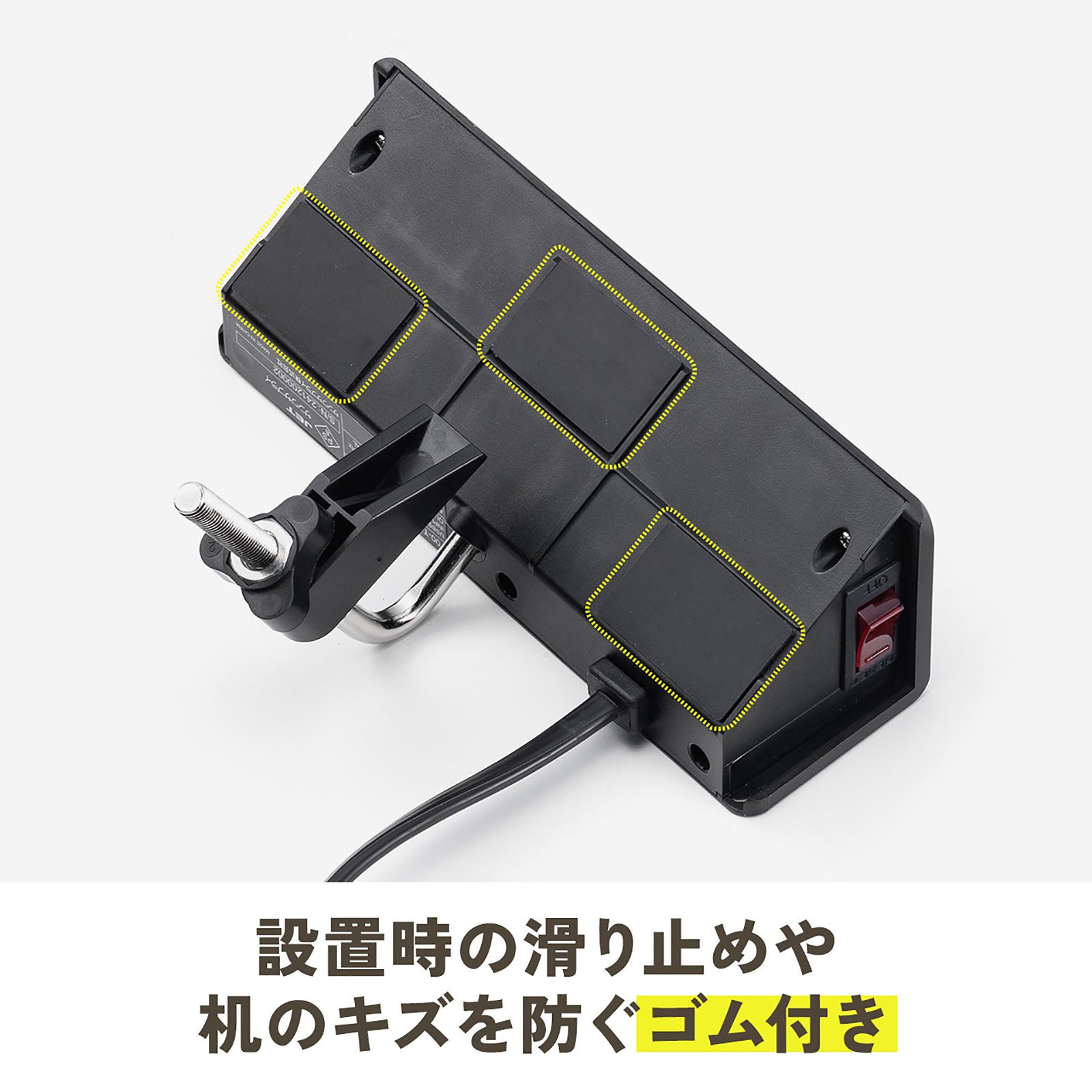 電源タップをデスクにしっかり固定できるクランプ式です。作業中にケーブルを抜き差ししてもタップが動かず、使いやすいです。テレワークや配線整理にもぴったりで、昇降デスクや棚の下など幅広く対応可能です。