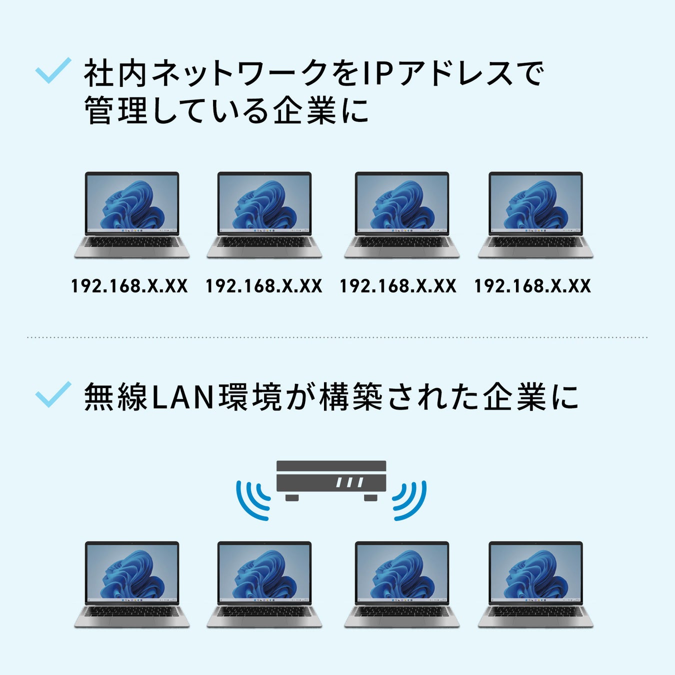 LAN端子を搭載していないので、社内ネットワークをIPアドレスで管理している企業や無線LAN環境が構築された社内での利用に最適です。