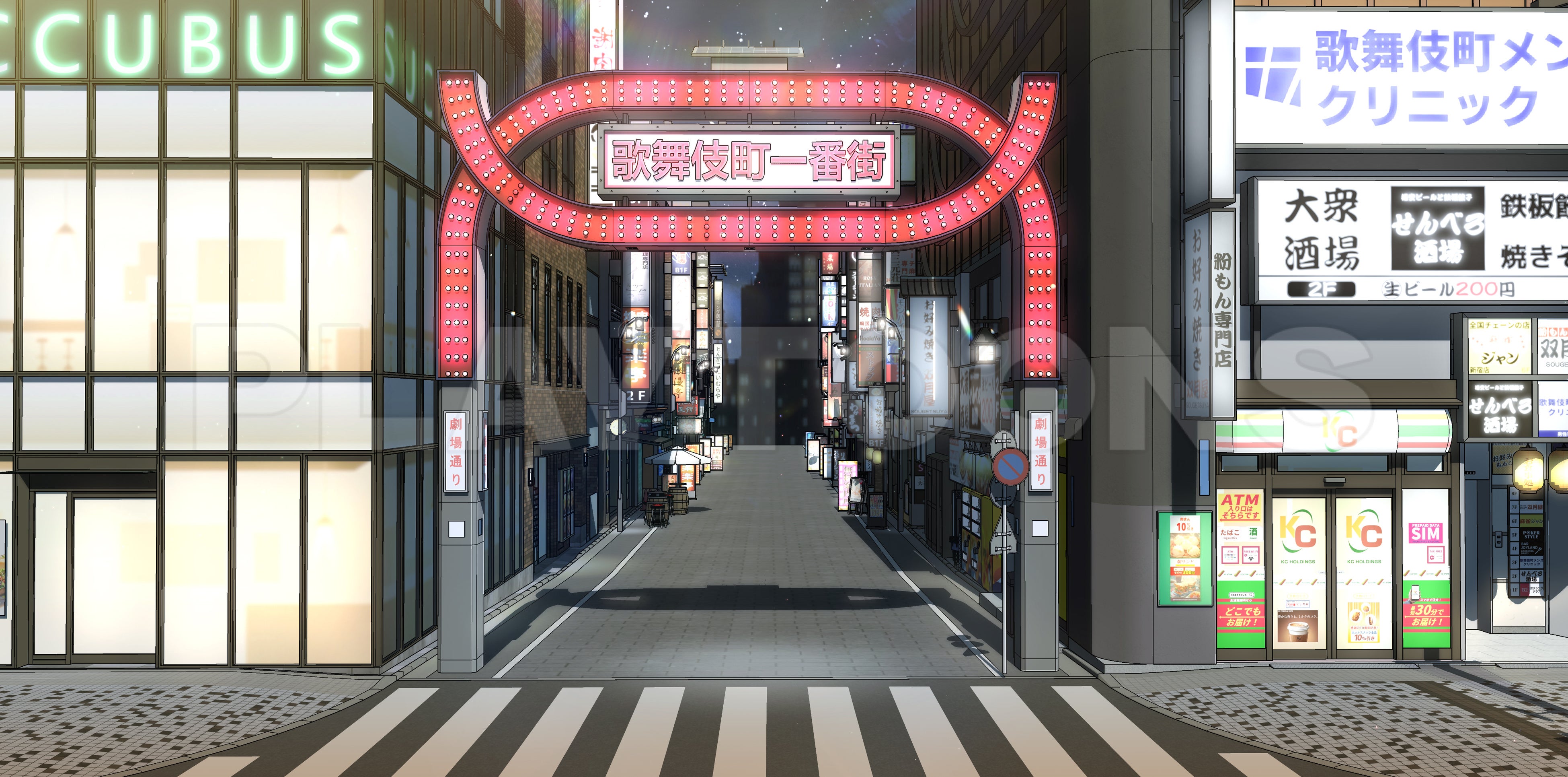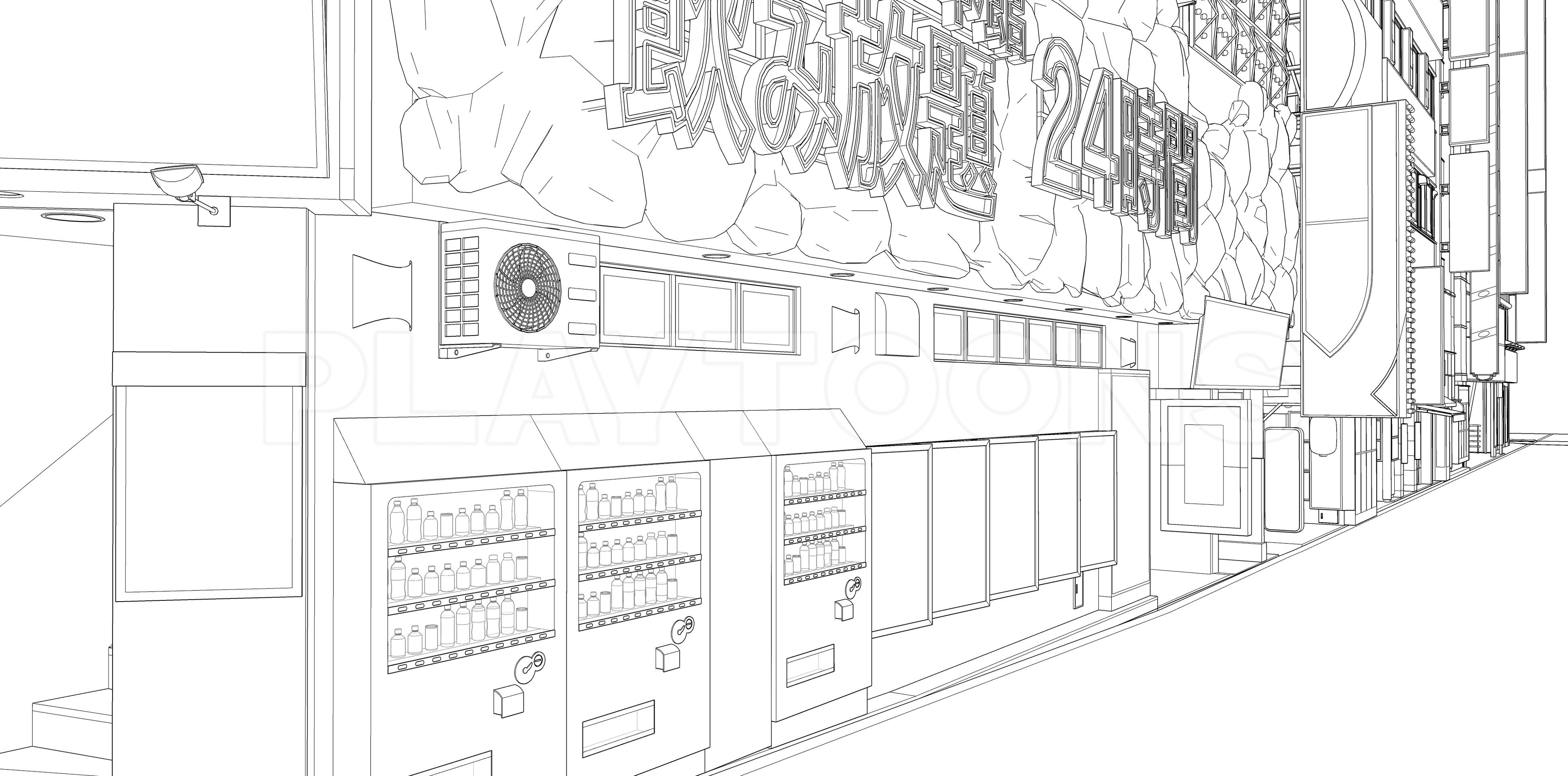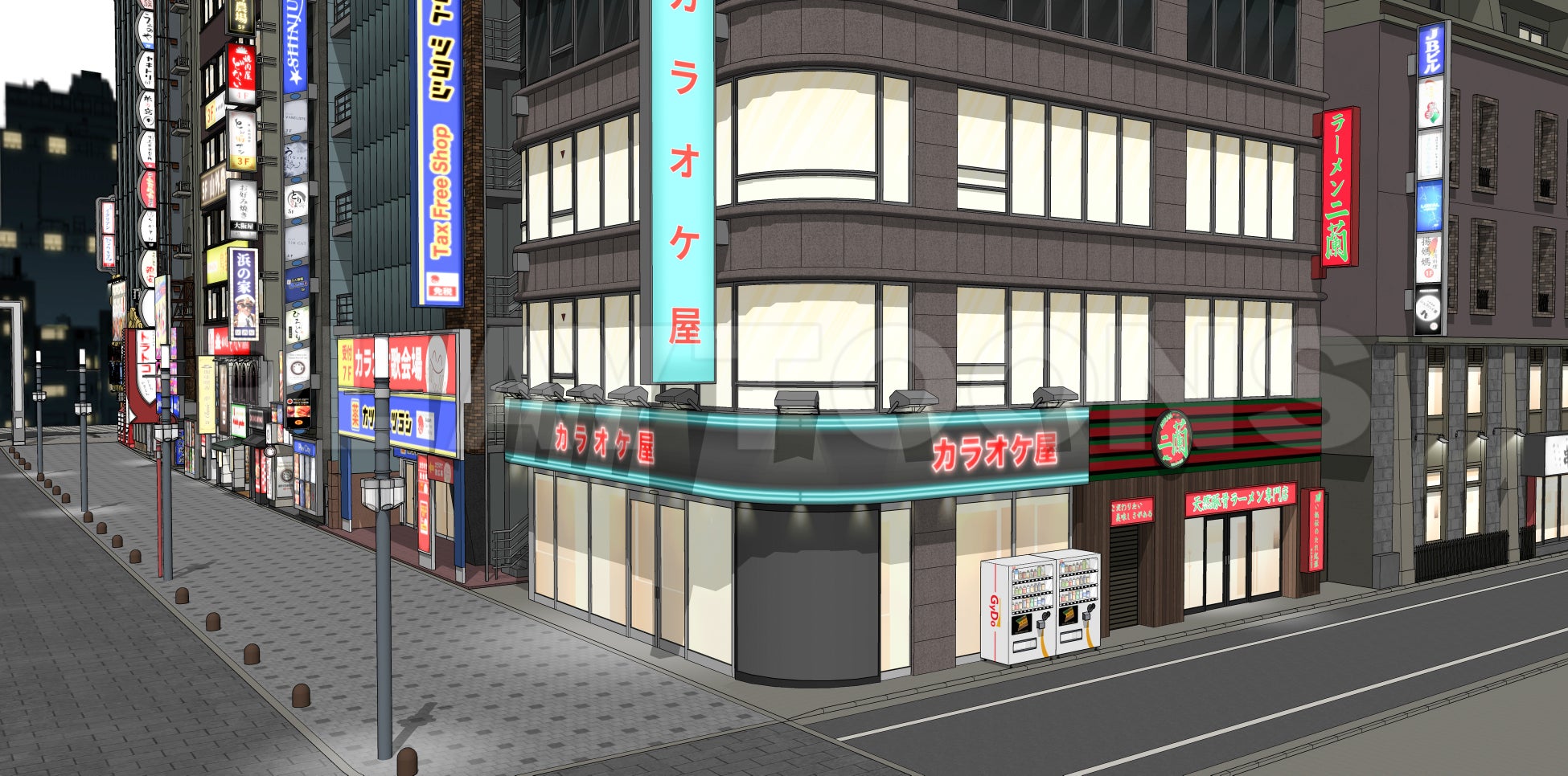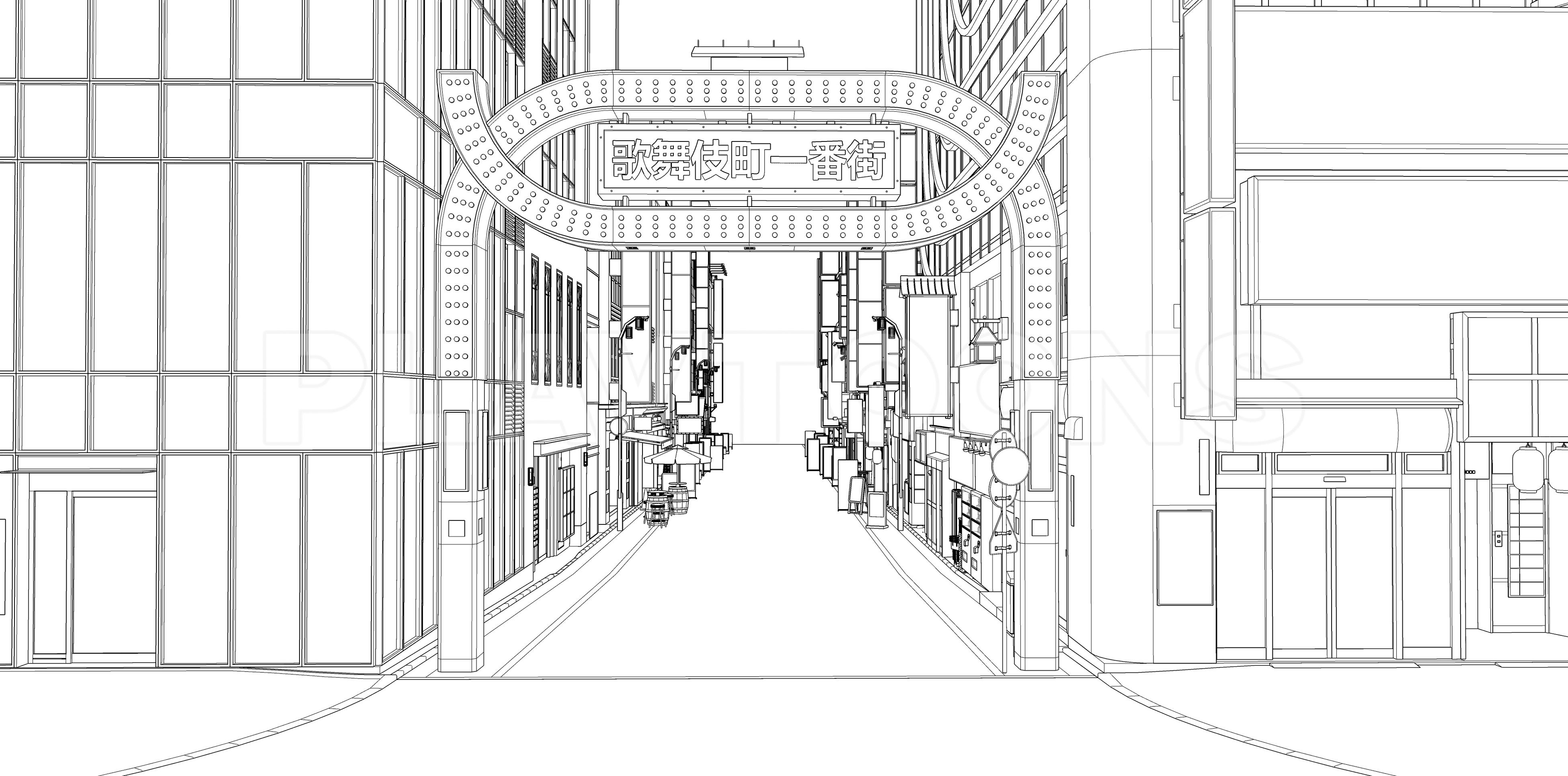 SketchUpを使用して細部にわたり精密に作成されたこのセットは、歌舞伎町一番街のアーチから始まる1ブロックを完全にカバーしており、WEBTOON(ウェブトゥーン)や漫画の制作者にとって理想的な背景素材となります。