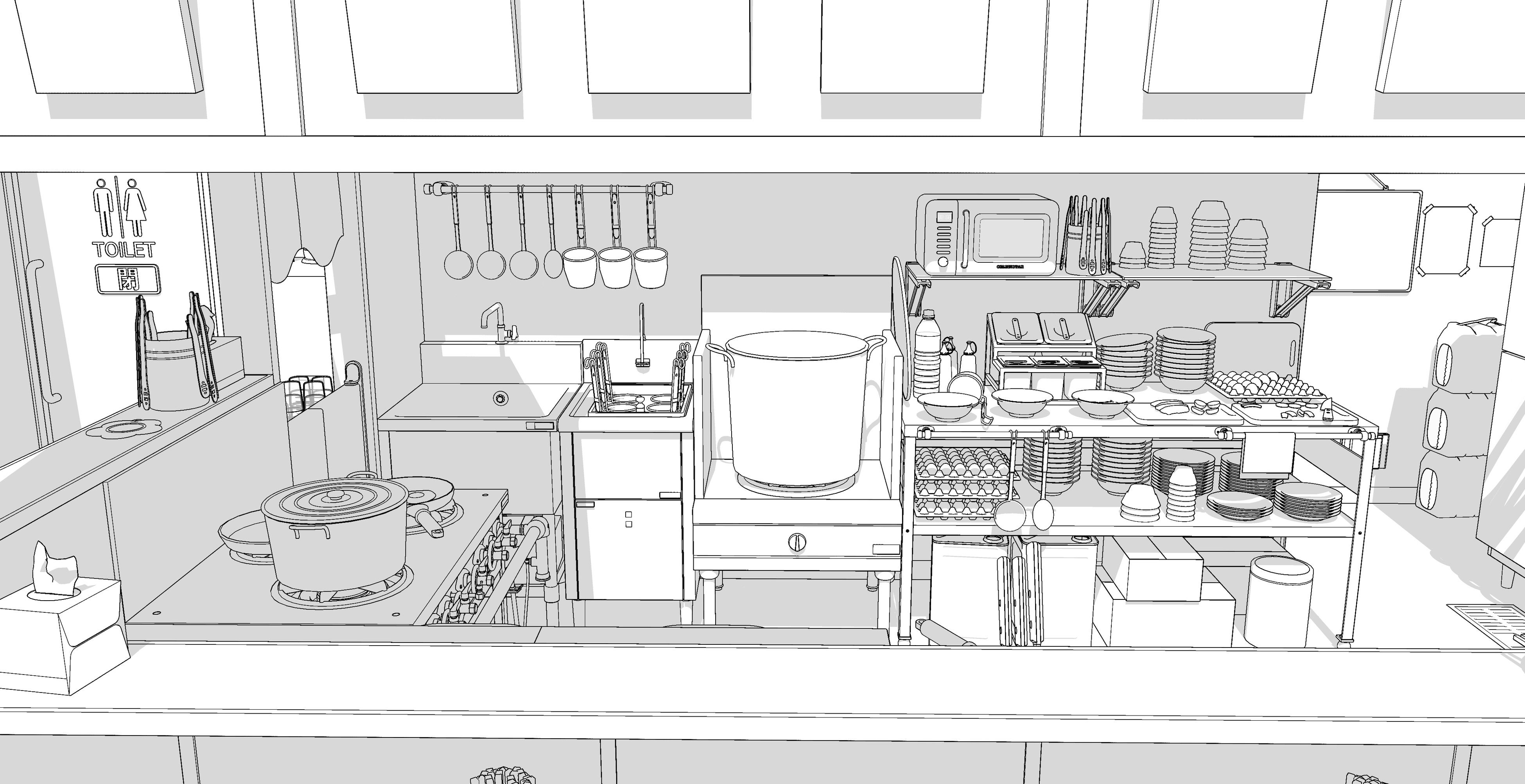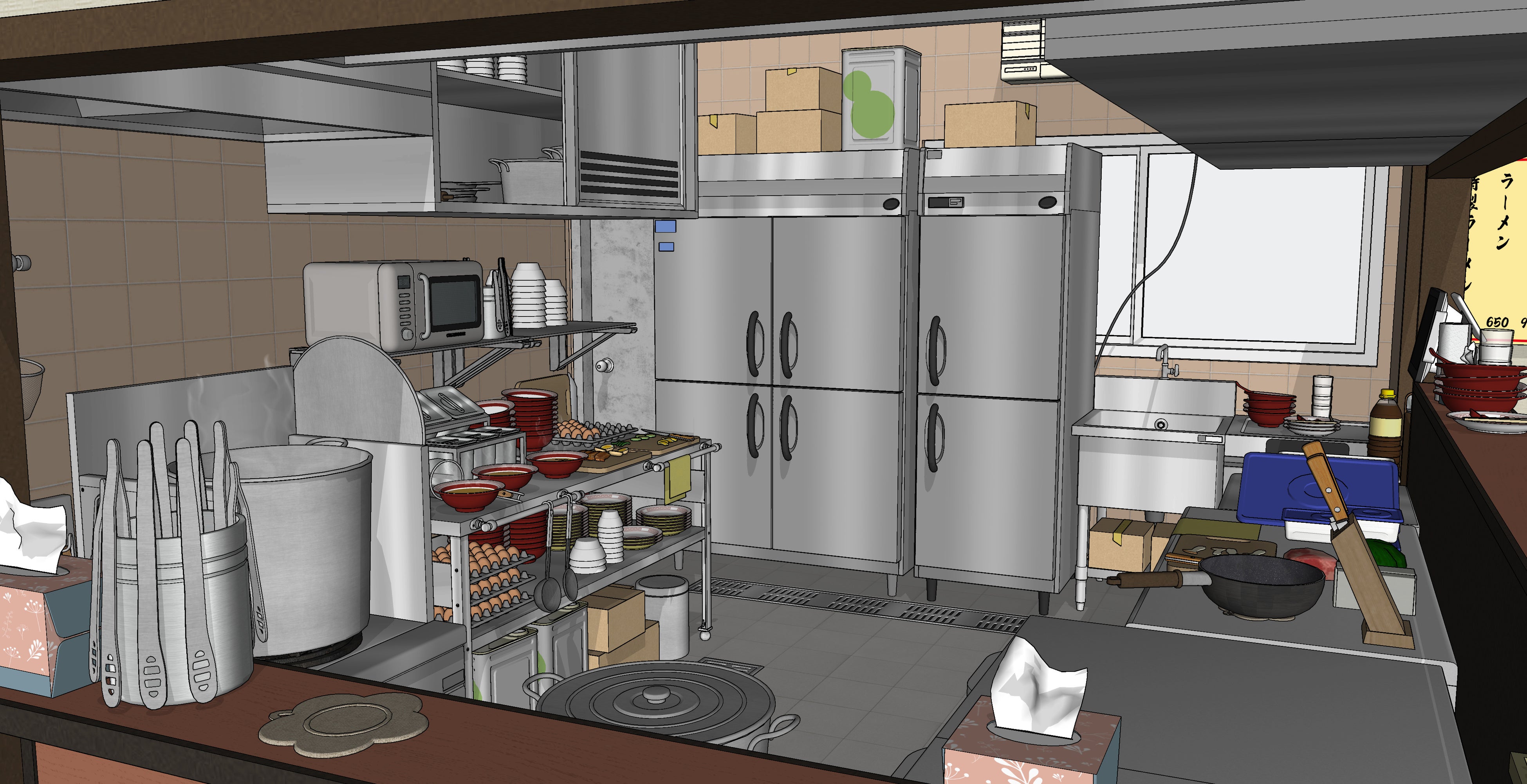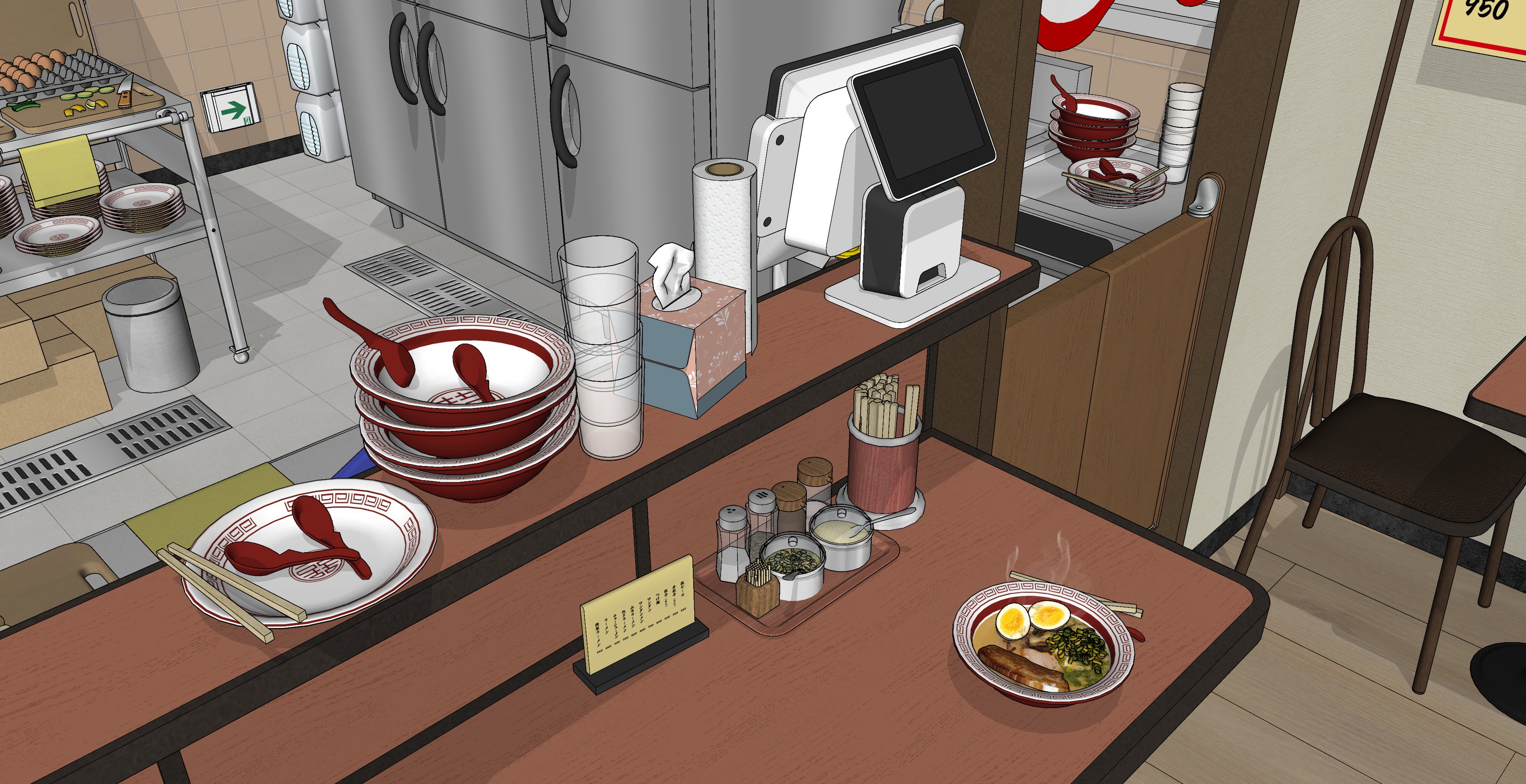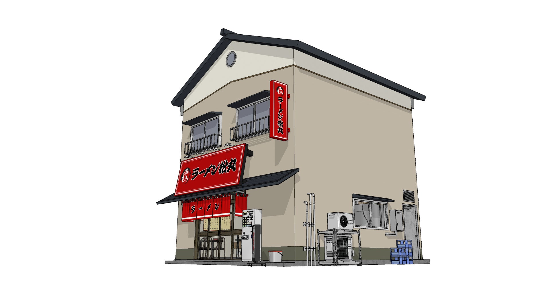 1階建ての外観と内部の詳細な構造が一つのパッケージに含まれており、座席エリアから厨房機器までリアルなラーメン屋の雰囲気を演出するための全てが揃っています。
