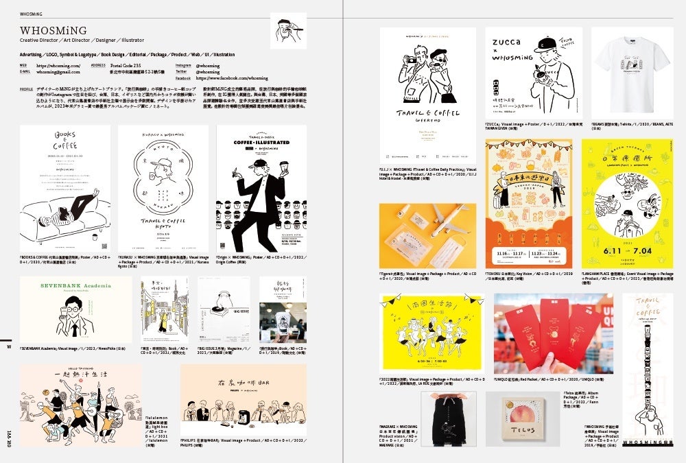 おもに「広告」「ロゴ、シンボル&書体」「装丁」「エディトリアル」「パッケージ」「プロダクト」「Web」「UI」「イラストレーション」の分野で活動しているクリエイターたちのポートフォリオを見開きで掲載。台湾デザイン界の重鎮から超新星まで幅広く紹介されているのが特徴です。