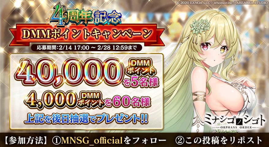 合同会社EXNOA(本社:東京都港区、CEO:村中 悠介、URL:https://games.dmm.com/)は、ターン制コマンドバトルRPG『ミナシゴノシゴト』(https://entry-site.minashigo-yusya.com/)において、2月14日(金)メンテナンス後より、4周年イベント「勇者列する聖燭祭祀」を開催しました。