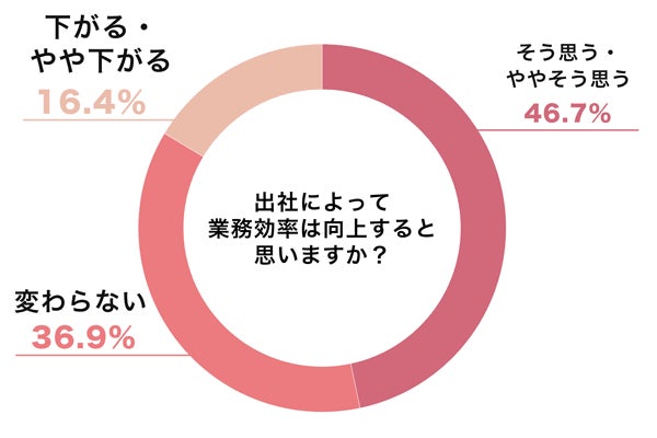 「出社によって業務効率は向上すると思いますか」という質問に対しては、約半数が「そう思う・ややそう思う」と回答したのに対し、「変わらない」「下がる・やや下がる」と回答した人も同様に半数という結果になりました。
