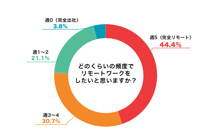 実際にリモートワークの経験がある社会人の方を対象にリモートワークの理想の頻度についてアンケート調査を実施したところ、44.4%の人が「週5(フルリモート)」と回答しました。