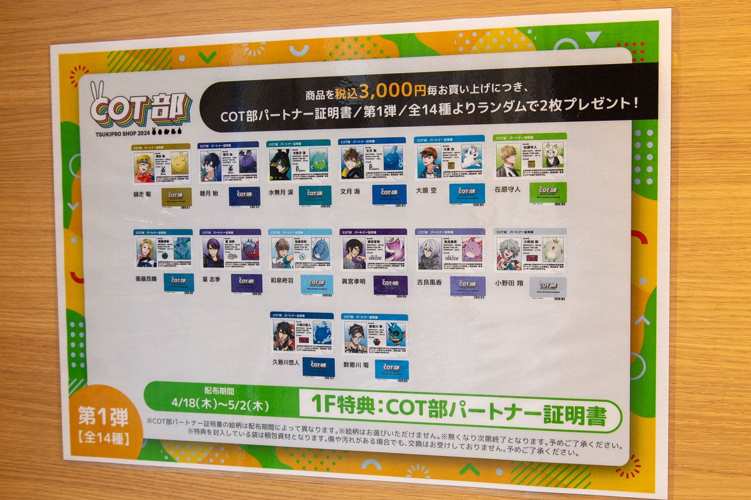 「COT部パートナー証明書」は店頭1階または通信販売「TSUKIPRO SHOP」にて税込3,000円毎にランダムで2枚プレゼント。5月2日(木)までは第一弾として、駆、始、涙、海、空、守人、昂輝、志季、柊羽、孝明、凰香、翔、悠人、零の14種が登場します。
