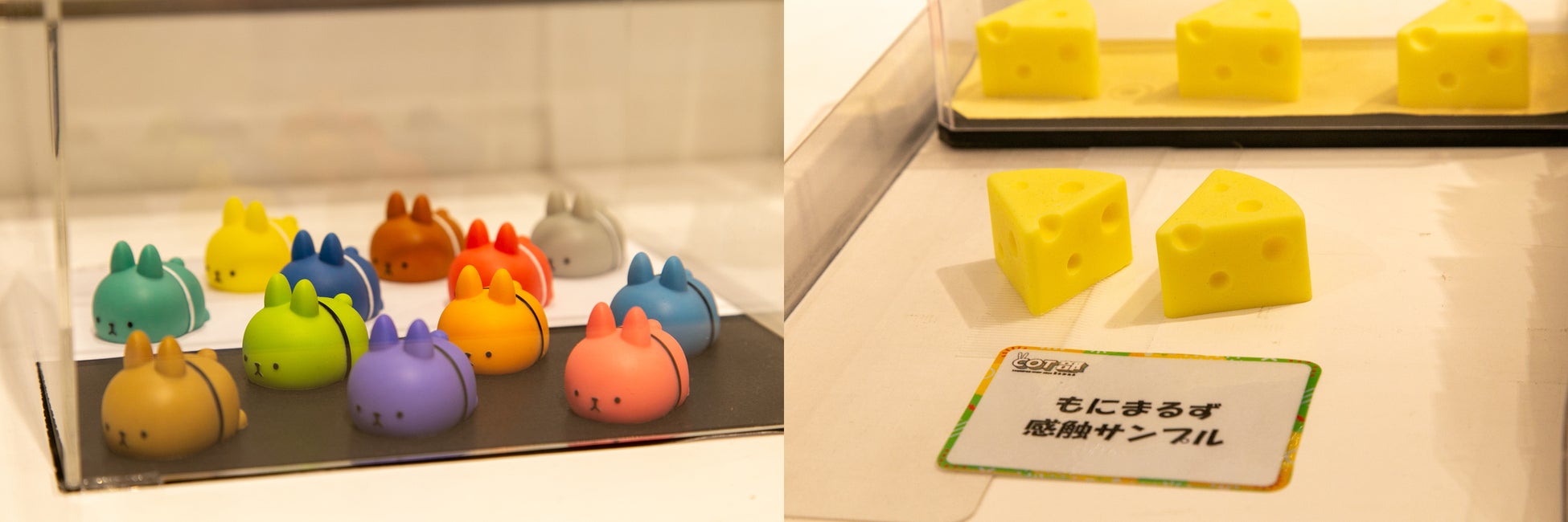 さらに、現在通販受付中の「もにまるず」の見本が展示されており、横には感触を試せるサンプルもありました。マシュマロのようなぷにっとした柔らかさはぜひ触って体感してみてください!