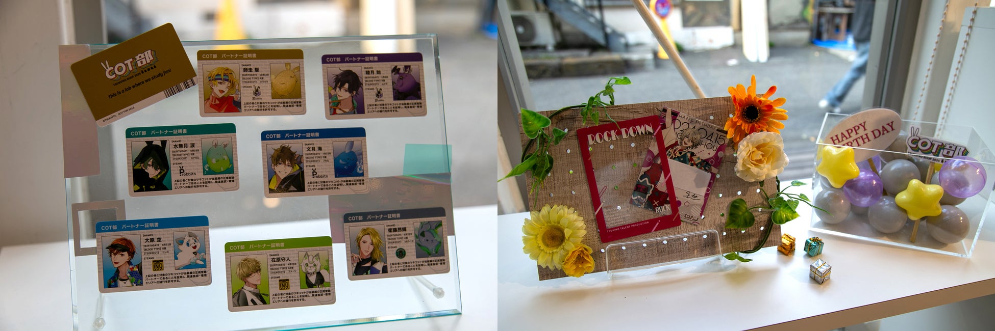 窓際にはズラリとアクスタが並んでいるほか、ショップの購入特典の「COT部パートナー証明書」や、「バースデーブロマイド」の見本も展示されています。