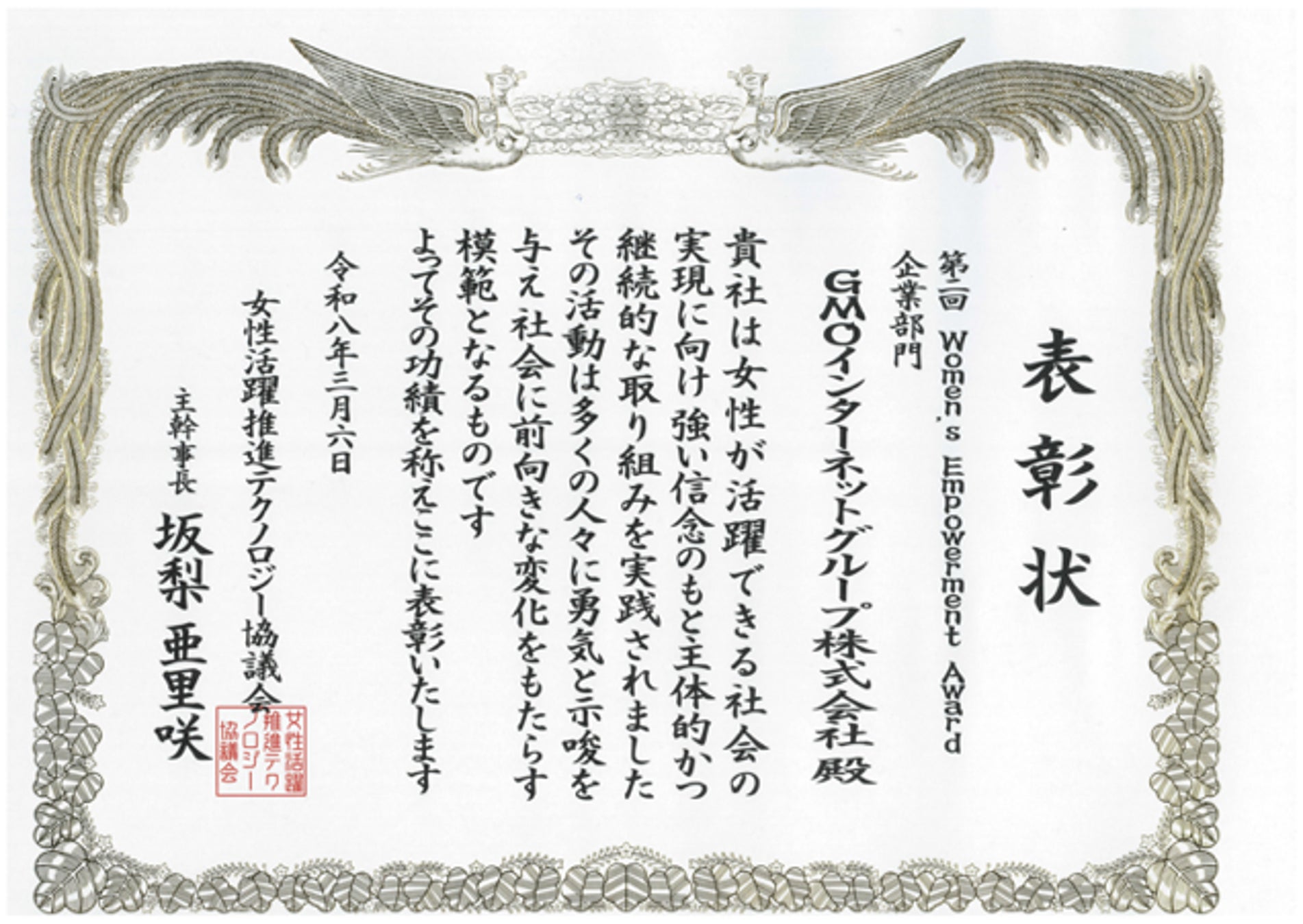 GMOインターネットグループ株式会社(代表取締役グループ代表:熊谷正寿、以下 GMOインターネットグループ)は、女性活躍推進テクノロジー協議会が主催する「Women's Empowerment Award 2026」の企業部門において受賞いたしました。本アワードの授賞式は、2026年3月6日(金)に開催された「WE Health 2026」にて執り行われました。