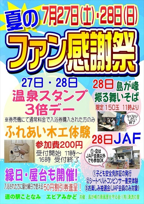 JAF(一般社団法人日本自動車連盟)香川支部(支部長 灘波 順一)は7月27日(土)から28日(日)の2日間、 “道の駅ことなみ エピアみかど”で開催される「夏のファン感謝祭 in 道の駅ことなみ エピアみかど」にJAFブース(※7月28日のみ)を出展します。