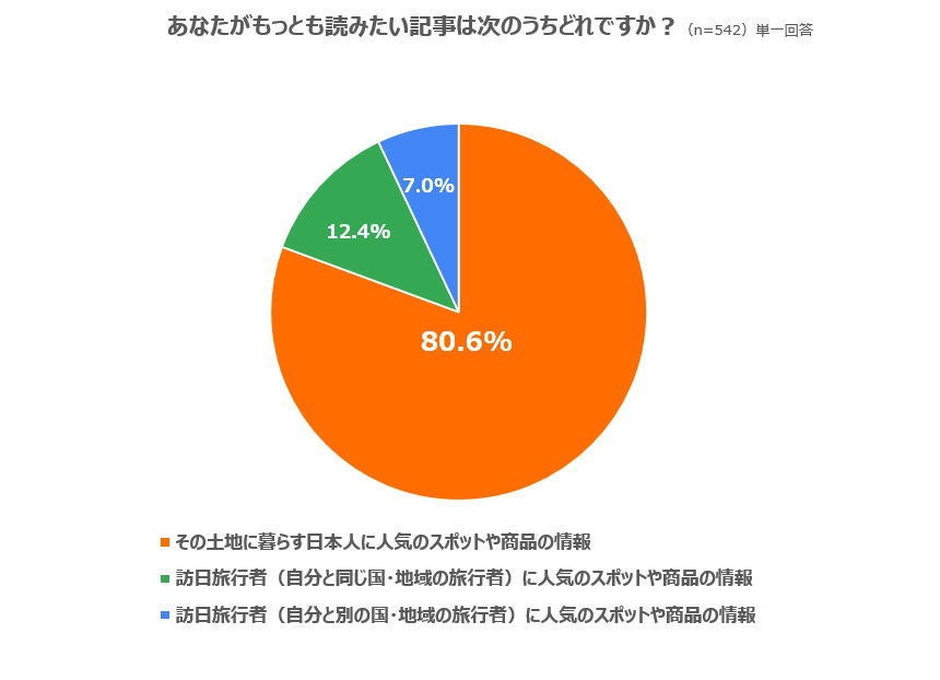 情報収集を行う外国人旅行者は、どのような記事を求めているのでしょうか。同調査では、「あなたがもっとも読みたい記事は次のうちどれですか?」という問いで、誰の目線で書かれているものがもっとも読みたいかを尋ねました。「その土地に暮らす日本人に人気のスポットや商品の情報」、「訪日旅行者(自分と同じ国・地域の旅行者)に人気のスポットや商品の情報」、「訪日旅行者(自分と別の国・地域の旅行者)に人気のスポットや商品の情報」の3択による単一回答としました。