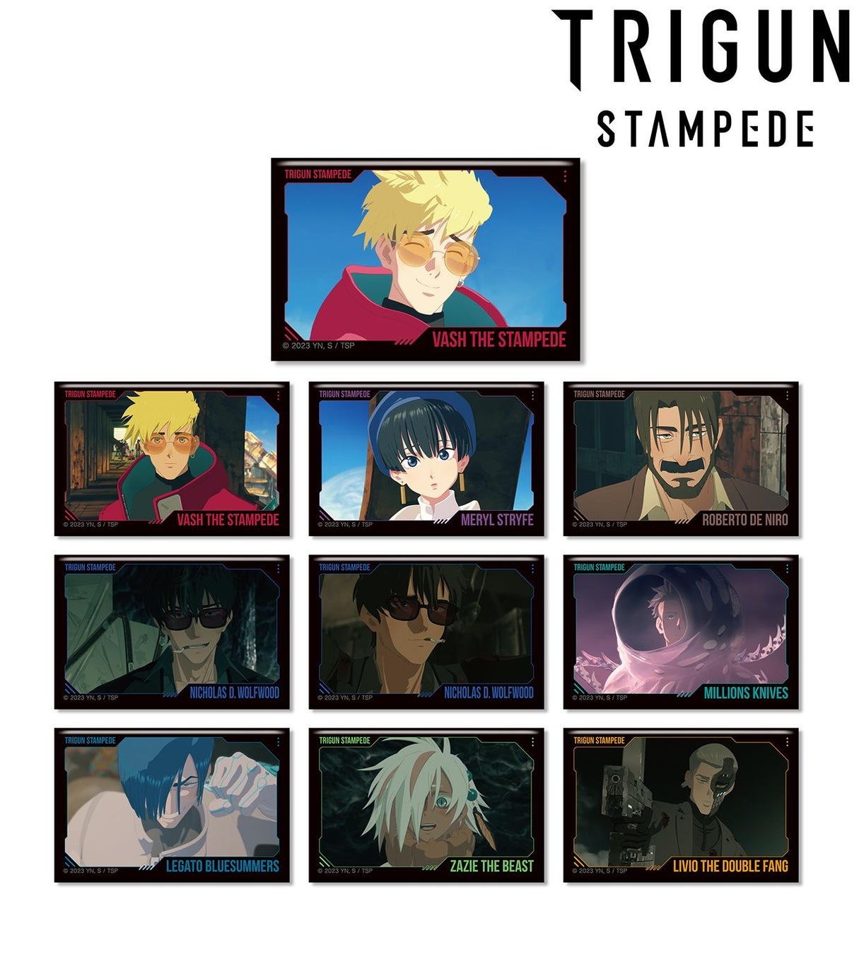 ヴァッシュ・ザ・スタンピード、メリル・ストライフ、ロベルト・デニーロ、ニコラス・D・ウルフウッド、ミリオンズ・ナイヴズ、レガート・ブルーサマーズ、ザジ・ザ・ビースト、リヴィオ・ザ・ダブルファングの印象的なシーンをアクリルカードに仕上げました。