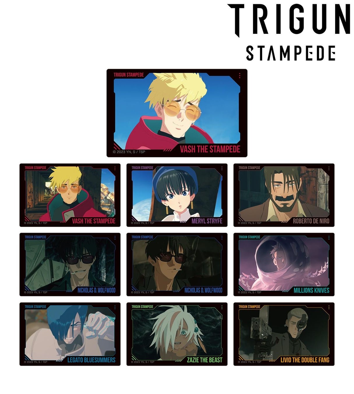 ヴァッシュ・ザ・スタンピード、メリル・ストライフ、ロベルト・デニーロ、ニコラス・D・ウルフウッド、ミリオンズ・ナイヴズ、レガート・ブルーサマーズ、ザジ・ザ・ビースト、リヴィオ・ザ・ダブルファングの印象的なシーンをカードステッカーに仕上げました。