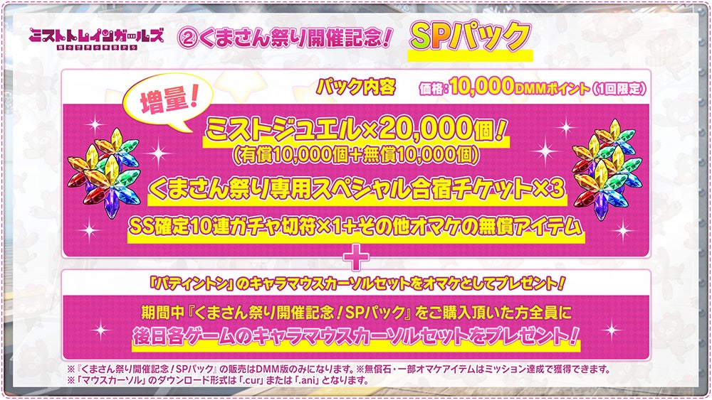 購入したユーザー様は、ミストジュエル×20000個 (有償10000個+無償10000個(ログイン1日目で獲得))、くまさん祭り専用合宿チケット×3、その他オマケの無償アイテムをログボでプレゼントいたします。