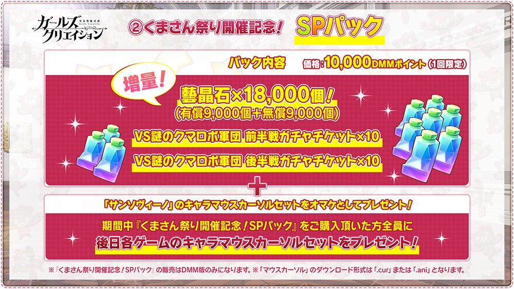 イベント開催期間中1回限定で、豪華アイテムがたくさん詰まった『くまさん祭り開催記念!SPパック』を10,000DMMポイントで販売いたします!