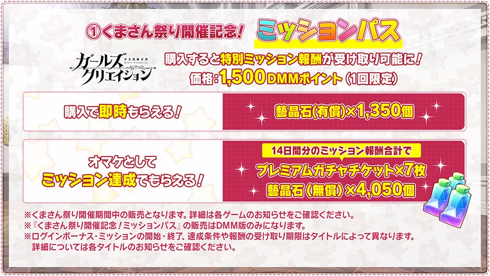 イベント開催期間中1回限定で、特別ミッション報酬が受け取り可能になる『くまさん祭り開催記念!ミッションパス』を1,500DMMポイントで販売します!