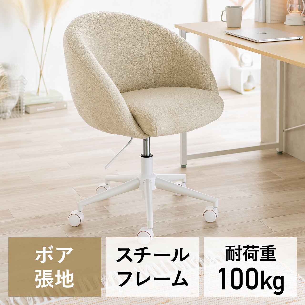 本製品はふわふわのボア生地と丸みのあるデザインが魅力のデスクチェアです。高反発クッションを内蔵し、見た目の可愛らしさと快適な座り心地を両立。ナチュラルや北欧テイストのお部屋にもなじみやすく、インテリア性の高い一脚です。ガス圧式の昇降機能やキャスターも備え、見た目だけでなく機能性も充実しています。