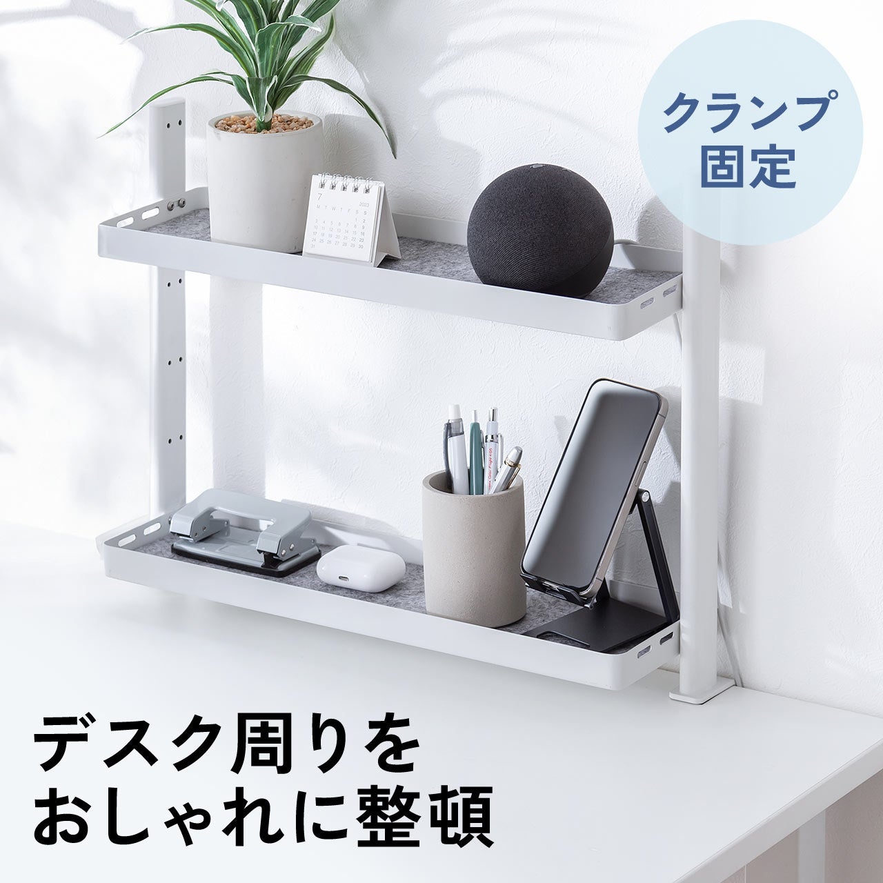 本製品はクランプで簡単&しっかり取り付け可能な2段式収納トレーです。文房具やスマホ、観葉植物や小物などの整理整頓に最適で、机上の垂直空間を有効活用できます。各トレーは前後3段階・上下6段階の細かな調整が可能で、使いやすさも抜群。耐荷重は各2kgです。トレーにはフェルト素材の中敷き付きで傷防止にも配慮。スチール製なので外側にはマグネットが付きます。