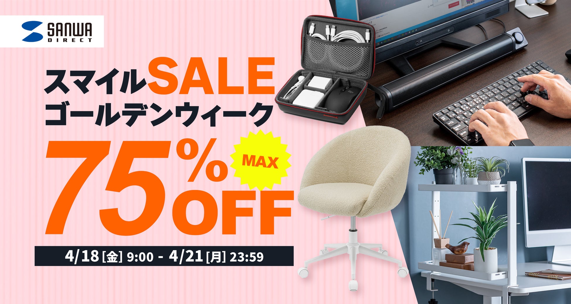 サンワサプライ株式会社(本社:岡山市北区田町1-10-1、 代表取締役社長 山田 和範)が運営するサンワダイレクト Amazon店は、Amazon.co.jpにて1428製品が最大75%OFFになるタイムセールを4月18日(金)から4月21日(月)までの4日間開催いたします。