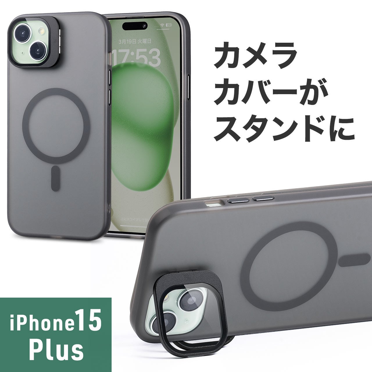 本製品はカメラカバーがスタンドにもなるiPhone15 Plus専用のソフトケースです。弾力性があり、傷や衝撃に強いTPU素材を採用しています。