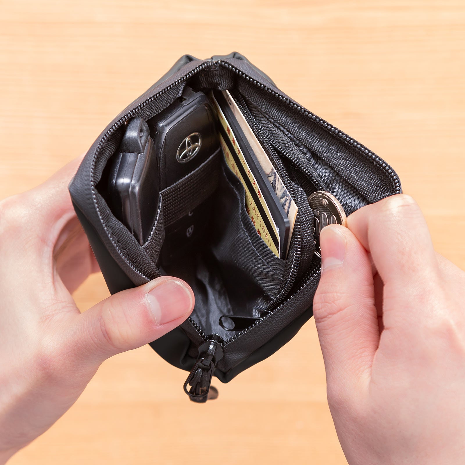 薄型&正方形デザインでポケットに収まりやすいのに、収納力は抜群。スマートキー、カード、小銭、紙幣まで整理して収納可能。その他、アクセサリーポーチとしても使えます。