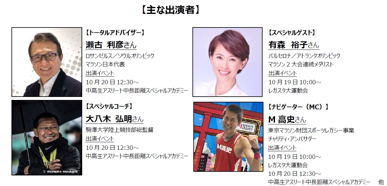 日本を代表するマラソン界のレジェンド 瀬古 利彦さん、有森 裕子さんを始め、スポーツの魅力をお届けする多彩なゲストによる催しや、個人やご家族などのグループでも楽しめる様々な企画でイベントを盛り上げていきます。
