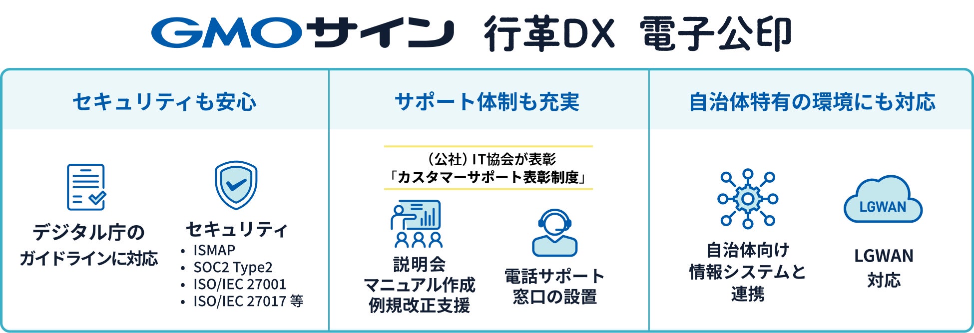 「GMOサイン電子公印」の正式導入にあたっては、電子契約サービス「GMOサイン」の利用を通して、専任担当者が導入・利用・定着まで伴走する「導入支援」サポートが決め手の一つとなりました。そのほか、大分県が「GMOサイン電子公印」を導入した際の選定ポイントは次の通りです。