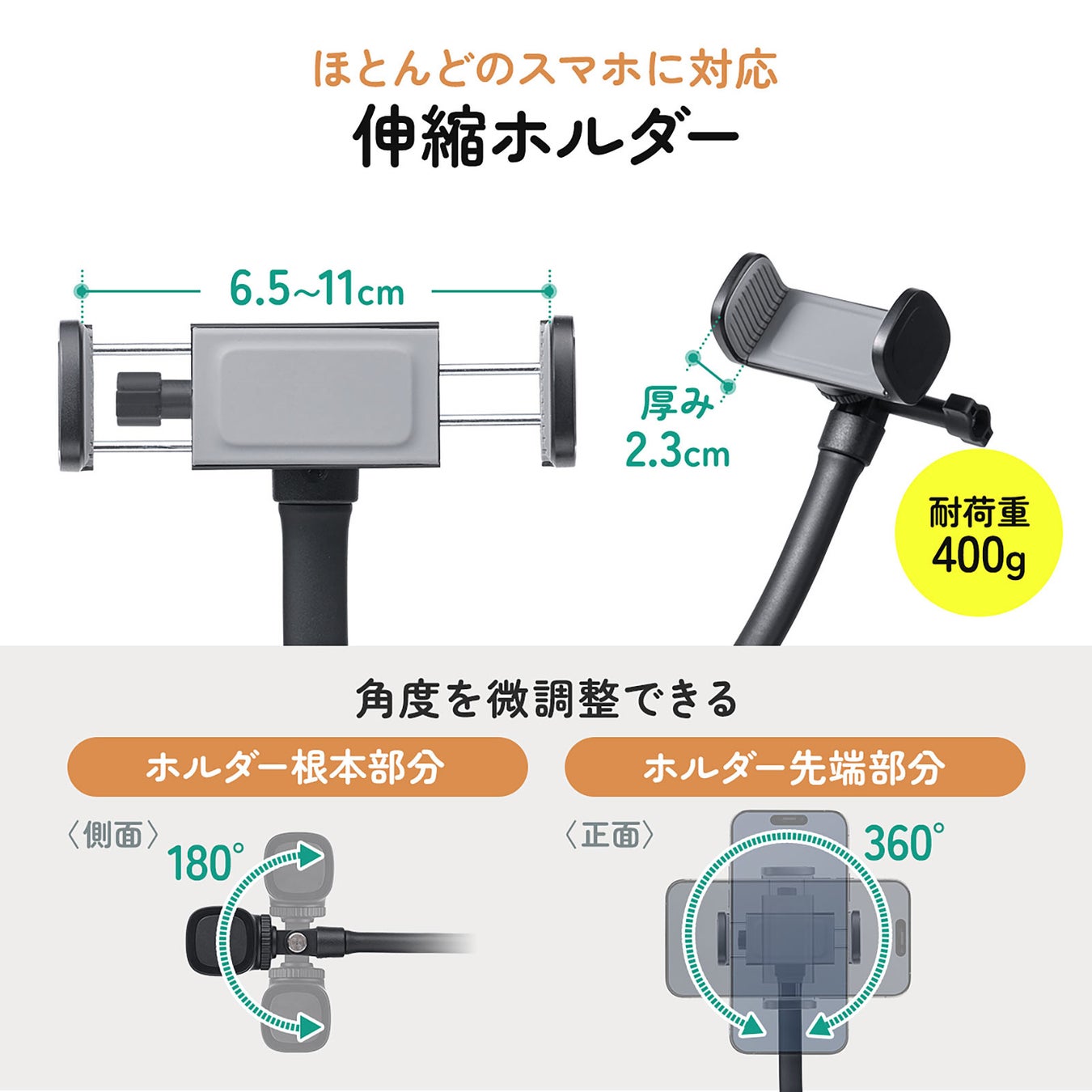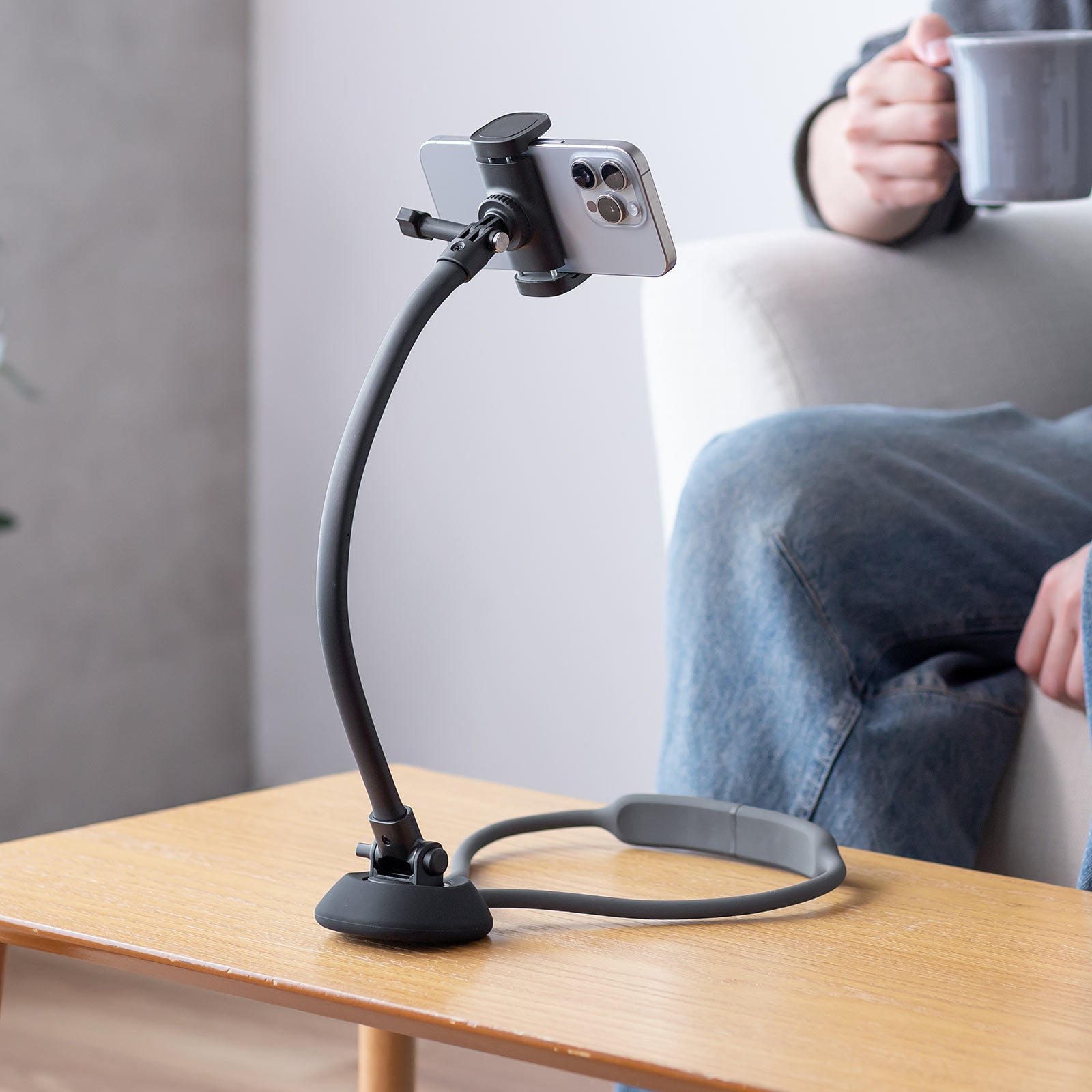 自在に曲がるロングアームを採用し、スマホの角度や距離を自由に調整できます。顔の前にピタッとセットできるので、画面が見やすく、姿勢も楽に保てます。撮影時のアングル調整もスムーズにこなせる頼れる相棒です。
